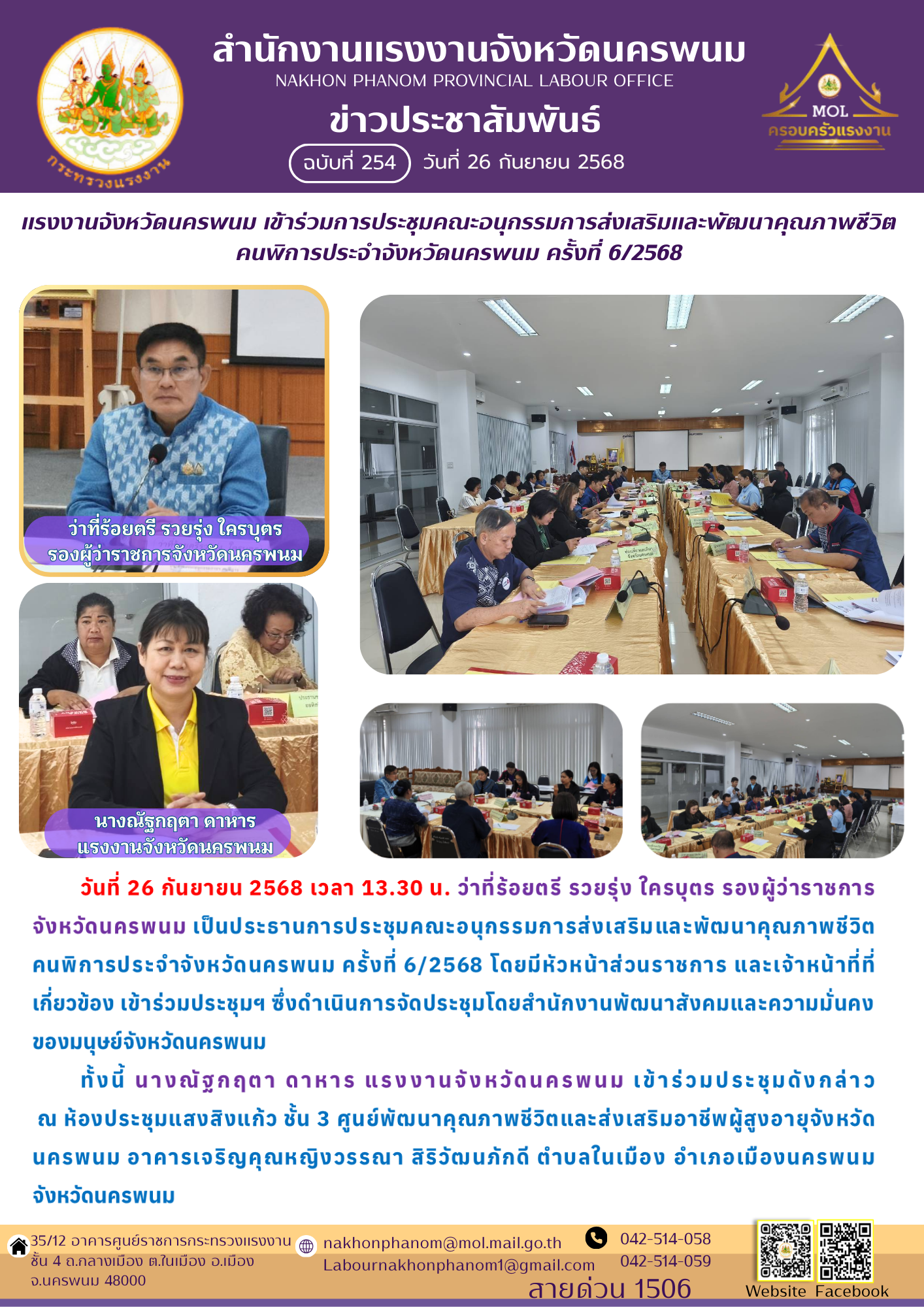 แรงงานจังหวัดนครพนม เข้าร่วมการประชุมคณะอนุกรรมการส่งเสริมและพัฒนาคุณภาพชีวิต คนพิการประจำจังหวัดนครพนม ครั้งที่ 6/2568