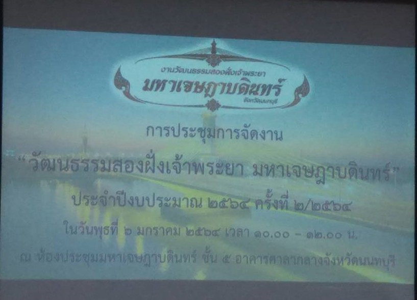 วันที่ 6 มกราคม 2564 เวลา 10.00น. นายวิชิตร สุวรรณมาก แรงงานจังหวัดนนทบุรี ร่วมประชุมการจัดงาน “วัฒนธรรมสองฝั่งเจ้าพระยา มหาเจษฏาบดินทร์” ประจำปีงบประมาณ พ.ศ. 2564 ครั้งที่ 2/2564 ณ ห้องประชุมมหาเจษฏาบดินทร์ ชั้น 5 ศาลากลางจังหวัดนนทบุรี เพื่อหารือแนวทางการจัดงานให้สอดคล้องกับมาตราการป้องกันการแพร่ระบาดของเชื้อไวรัสโคโรนา 2019 โดยมีนายสุจินต์ ไชยชุมศักดิ์ ผู้ว่าราชการจังหวัดนนทบุรี เป็นประธานการประชุมดังกล่าว