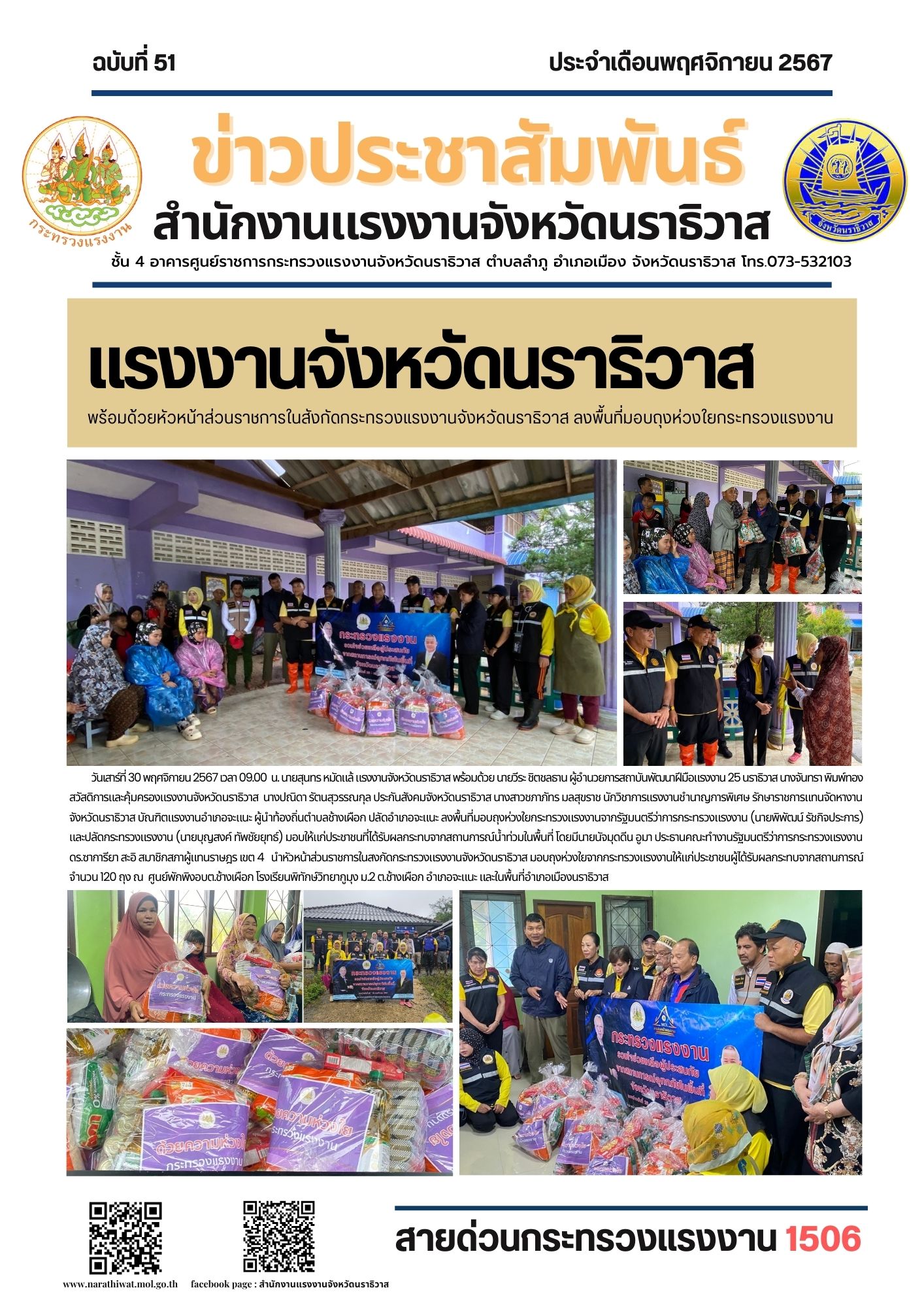 วันเสาร์ที่ 30 พฤศจิกายน 2567 เวลา 09.00 น. นายสุนทร หมัดแล้ แรงงานจังหวัดนราธิวาส พร้อมด้วย นายวีระ ชิตชลธาน ผู้อำนวยการสถาบันพัฒนาฝีมือแรงงาน 25 นราธิวาส นางจันทรา พิมพ์ทองสวัสดิการและคุ้มครองแรงงานจังหวัดนราธิวาส นางปณิดา รัตนสุวรรณกุล ประกันสังคมจังหวัดนราธิวาส นางสาวชภาภัทร มลสุขราช นักวิชาการแรงงานชำนาญการพิเศษ รักษาราชการแทนจัดหางานจังหวัดนราธิวาส บัณฑิตแรงงานอำเภอจะแนะ ผู้นำท้องถิ่นตำบลช้างเผือก ปลัดอำเภอจะแนะ ลงพื้นที่มอบถุงห่วงใยกระทรวงแรงงานจากรัฐมนตรีว่าการกระทรวงแรงงาน (นายพิพัฒน์ รัชกิจประการ) และปลัดกระทรวงแรงงาน (นายบุญสงค์ ทัพชัยยุทธ์) มอบให้แก่ประชาชนที่ได้รับผลกระทบจากสถานการณ์น้ำท่วมในพื้นที่ โดยมีนายนัจมุดดีน อูมา ประธานคณะทำงานรัฐมนตรีว่าการกระทรวงแรงงาน ดร.ซาการียา สะอิ สมาชิกสภาผู้แทนราษฎร เขต 4 นำหัวหน้าส่วนราชการในสงกัดกระทรวงแรงงานจังหวัดนราธิวาส มอบถุงห่วงใยจากกระทรวงแรงงานให้แก่ประชาชนผู้ได้รับผลกระทบจากสถานการณ์ จำนวน 120 ถุง ณ ศูนย์พักพิงอบต.ช้างเผือก โรงเรียนพิทักษ์วิทยากูมุง ม.2 ต.ช้างเผือก อำเภอจะแนะ และในพื้นที่อำเภอเมืองนราธิวาส