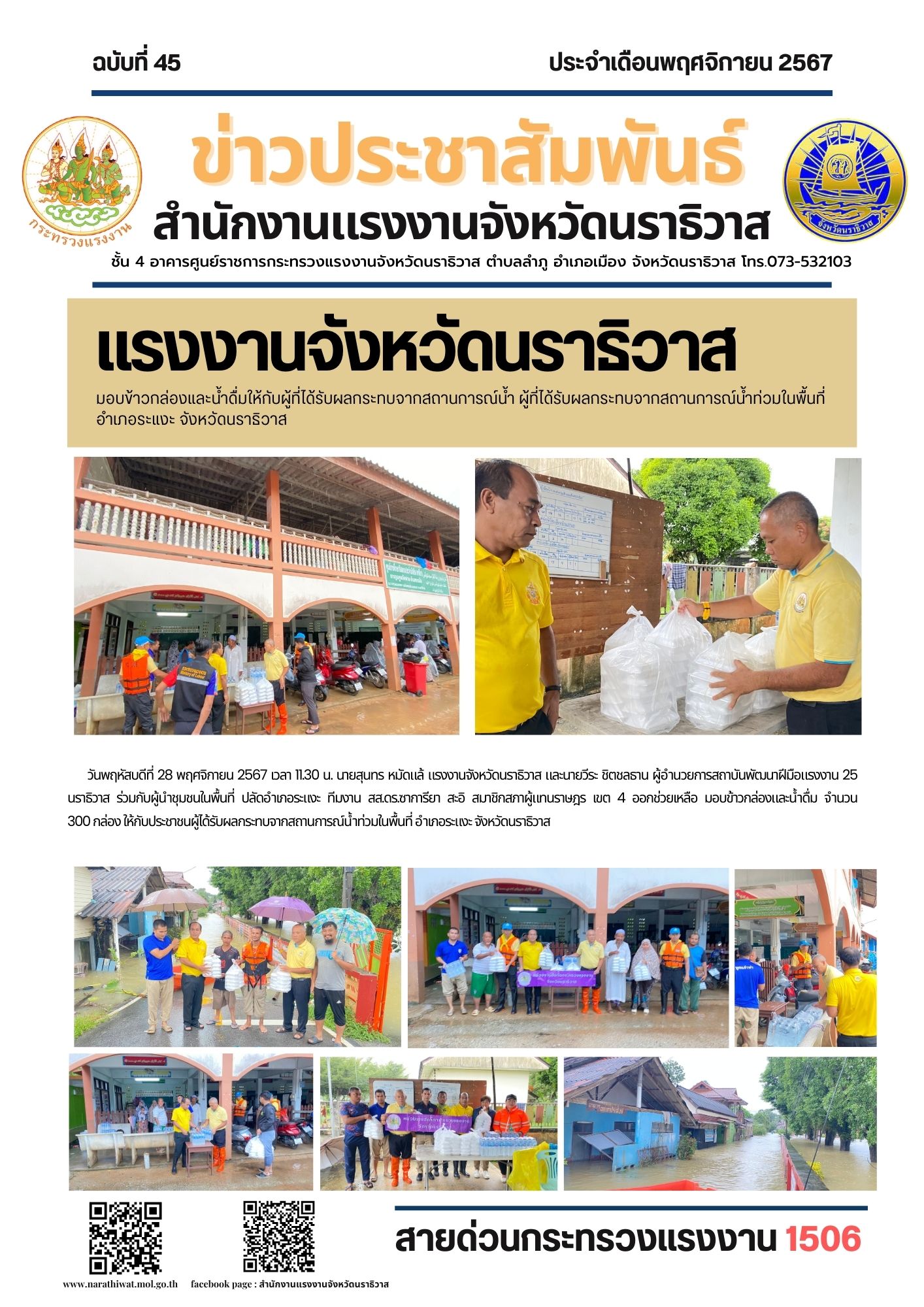 วันพฤหัสบดีที่ 28 พฤศจิกายน 2567 เวลา 11.30 น. นายสุนทร หมัดแล้ แรงงานจังหวัดนราธิวาส และนายวีระ ชิตชลธาน ผู้อำนวยการสถาบันพัฒนาฝีมือแรงงาน 25 นราธิวาส ร่วมกับผู้นำชุมชนในพื้นที่ ปลัดอำเภอระแงะ ทีมงาน สส.ดร.ซาการียา สะอิ สมาชิกสภาผู้แทนราษฎร เขต 4 ออกช่วยเหลือ มอบข้าวกล่องและน้ำดื่ม จำนวน 300 กล่อง ให้กับประชาชนผู้ได้รับผลกระทบจากสถานการณ์น้ำท่วมในพื้นที่ อำเภอระแงะ จังหวัดนราธิวาส