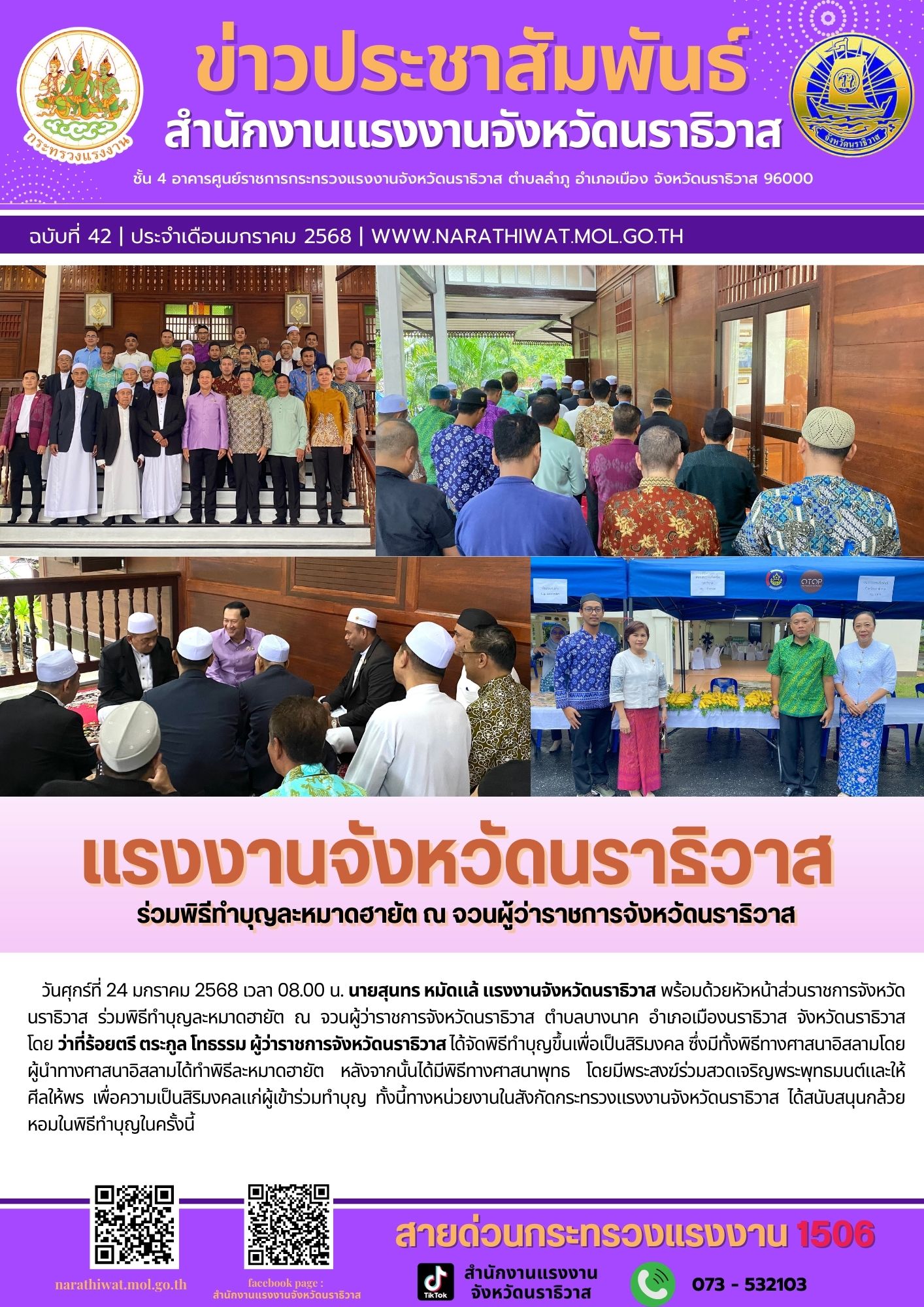 วันศุกร์ที่ 24 มกราคม 2568 เวลา 08.00 น. นายสุนทร หมัดแล้ แรงงานจังหวัดนราธิวาส พร้อมด้วยหัวหน้าส่วนราชการจังหวัดนราธิวาส ร่วมพิธีทำบุญละหมาดฮายัต ณ จวนผู้ว่าราชการจังหวัดนราธิวาส ตำบลบางนาค อำเภอเมืองนราธิวาส จังหวัดนราธิวาส โดย ว่าที่ร้อยตรี ตระกูล โทธรรม ผู้ว่าราชการจังหวัดนราธิวาส ได้จัดพิธีทำบุญขึ้นเพื่อเป็นสิริมงคล ซึ่งมีทั้งพิธีทางศาสนาอิสลามโดยผู้นำทางศาสนาอิสลามได้ทำพิธีละหมาดฮายัต หลังจากนั้นได้มีพิธีทางศาสนาพุทธ โดยมีพระสงฆ์ร่วมสวดเจริญพระพุทธมนต์และให้ ศีลให้พร เพื่อความเป็นสิริมงคลแก่ผู้เข้าร่วมทำบุญ ทั้งนี้ทางหน่วยงานในสังกัดกระทรวงแรงงานจังหวัดนราธิวาส ได้สนับสนุนกล้วยหอมในพิธีทำบุญในครั้งนี้
