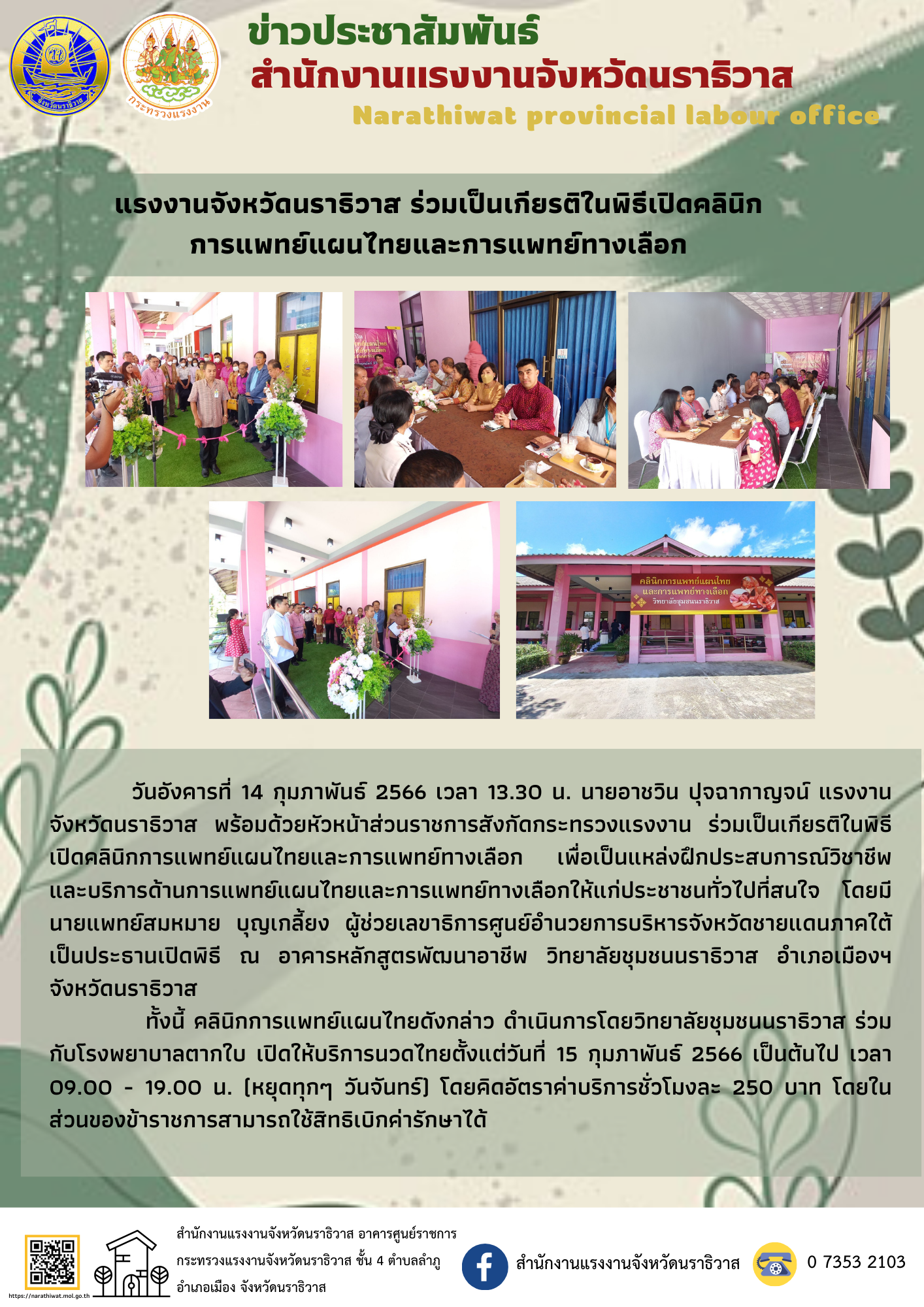 วันอังคารที่ 14 กุมภาพันธ์ 2566 เวลา 13.30 น. นายอาชวิน ปุจฉากาญจน์ แรงงานจังหวัดนราธิวาส พร้อมด้วยหัวหน้าส่วนราชการสังกัดกระทรวงแรงงาน ร่วมเป็นเกียรติในพิธีเปิดคลินิกการแพทย์แผนไทยและการแพทย์ทางเลือก เพื่อเป็นแหล่งฝึกประสบการณ์วิชาชีพและบริการด้านการแพทย์แผนไทยและการแพทย์ทางเลือกให้แก่ประชาชนทั่วไปที่สนใจ โดยมี นายแพทย์สมหมาย บุญเกลี้ยง ผู้ช่วยเลขาธิการศูนย์อำนวยการบริหารจังหวัดชายแดนภาคใต้ เป็นประธานเปิดพิธี ณ อาคารหลักสูตรพัฒนาอาชีพ วิทยาลัยชุมชนนราธิวาส อำเภอเมืองฯ จังหวัดนราธิวาส ทั้งนี้ คลินิกการแพทย์แผนไทยดังกล่าว ดำเนินการโดยวิทยาลัยชุมชนนราธิวาส ร่วมกับโรงพยาบาลตากใบ เปิดให้บริการนวดไทยตั้งแต่วันที่ 15 กุมภาพันธ์ 2566 เป็นต้นไป เวลา 09.00 – 19.00 น. (หยุดทุกๆ วันจันทร์) โดยคิดอัตราค่าบริการชั่วโมงละ 250 บาท โดยในส่วนของข้าราชการสามารถใช้สิทธิเบิกค่ารักษาได้