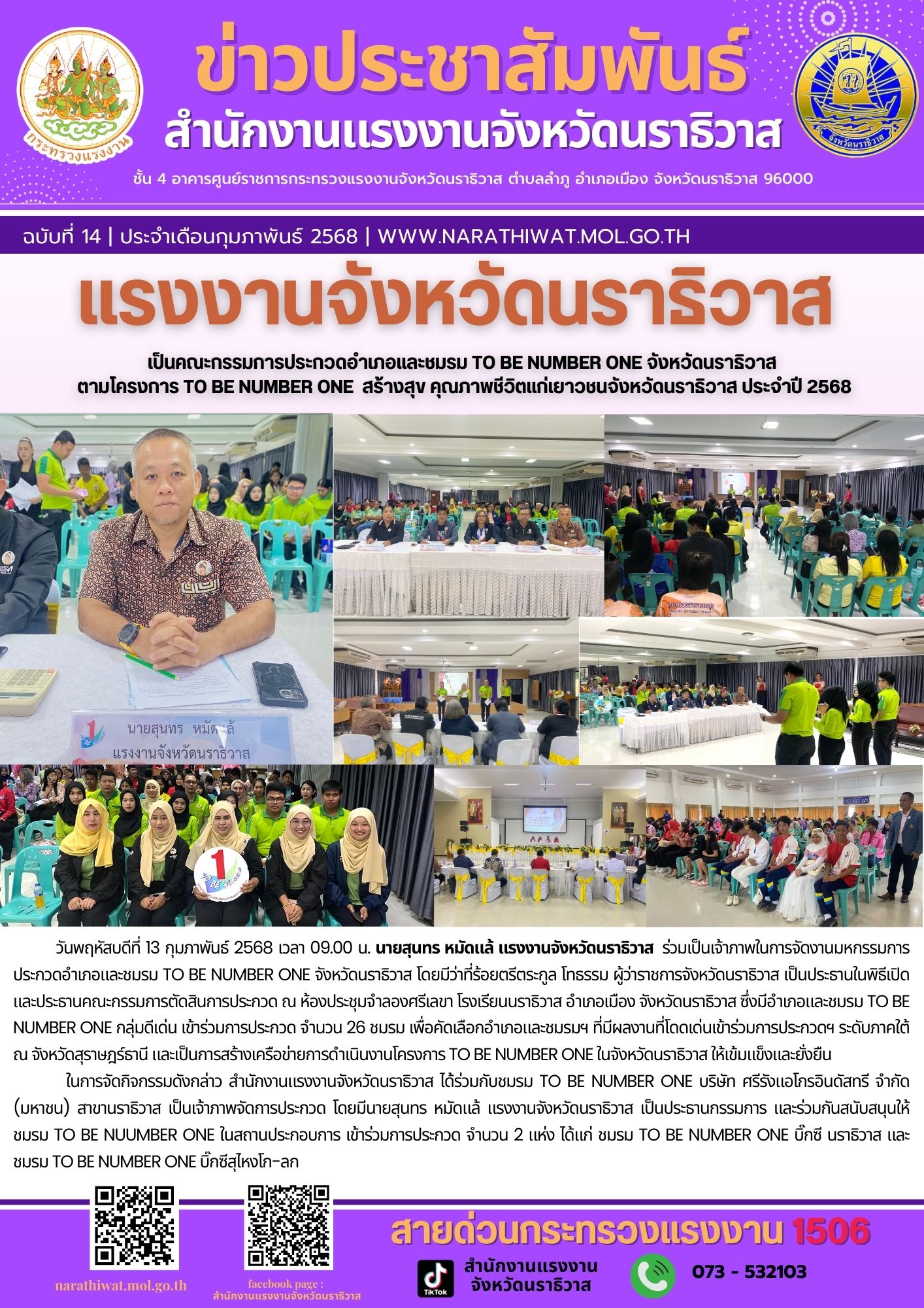วันพฤหัสบดีที่ 13 กุมภาพันธ์ 2568 เวลา 09.00 น. นายสุนทร หมัดแล้ แรงงานจังหวัดนราธิวาส ร่วมเป็นเจ้าภาพในการจัดงานมหกรรมการประกวดอำเภอและชมรม TO BE NUMBER ONE จังหวัดนราธิวาส โดยมีว่าที่ร้อยตรีตระกูล โทธรรม ผู้ว่าราชการจังหวัดนราธิวาส เป็นประธานในพิธีเปิดและประธานคณะกรรมการตัดสินการประกวด ณ ห้องประชุมจำลองศรีเลขา โรงเรียนนราธิวาส อำเภอเมือง จังหวัดนราธิวาส ซึ่งมีอำเภอและชมรม TO BE NUMBER ONE กลุ่มดีเด่น เข้าร่วมการประกวด จำนวน 26 ชมรม เพื่อคัดเลือกอำเภอและชมรมฯ ที่มีผลงานที่โดดเด่นเข้าร่วมการประกวดฯ ระดับภาคใต้ ณ จังหวัดสุราษฎร์ธานี และเป็นการสร้างเครือข่ายการดำเนินงานโครงการ TO BE NUMBER ONE ในจังหวัดนราธิวาส ให้เข้มแข็งและยั่งยืน ในการจัดกิจกรรมดังกล่าว สำนักงานแรงงานจังหวัดนราธิวาส ได้ร่วมกับชมรม TO BE NUMBER ONE บริษัท ศรีรังแอโกรอินดัสทรี จำกัด (มหาชน) สาขานราธิวาส เป็นเจ้าภาพจัดการประกวด โดยมีนายสุนทร หมัดแล้ แรงงานจังหวัดนราธิวาส เป็นประธานกรรมการ และร่วมกันสนับสนุนให้ชมรม TO BE NUUMBER ONE ในสถานประกอบการ เข้าร่วมการประกวด จำนวน 2 แห่ง ได้แก่ ชมรม TO BE NUMBER ONE บิ๊กซี นราธิวาส และ ชมรม TO BE NUMBER ONE บิ๊กซีสุไหงโก-ลก