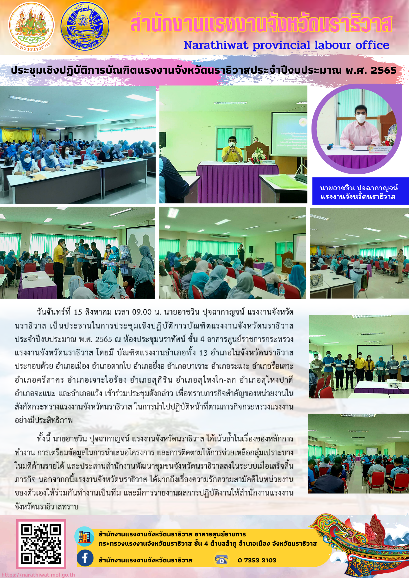 วันจันทร์ที่ 15 สิงหาคม เวลา 09.00 น. นายอาชวิน ปุจฉากาญจน์ แรงงานจังหวัดนราธิวาส เป็นประธานในการประชุมเชิงปฏิบัติการบัณฑิตแรงงานจังหวัดนราธิวาส ประจำปีงบประมาณ พ.ศ. 2565 ณ ห้องประชุมนราทัศน์ ชั้น 4 อาคารศูนย์ราชการกระทรวงแรงงานจังหวัดนราธิวาส โดยมี บัณฑิตแรงงานอำเภอทั้ง 13 อำเภอในจังหวัดนราธิวาส ประกอบด้วย อำเภอเมือง อำเภอตากใบ อำเภอยี่งอ อำเภอบาเจาะ อำเภอระแงะ อำเภอรือเสาะ อำเภอศรีสาคร อำเภอเจาะไอร้อง อำเภอสุคิริน อำเภอสุไหงโก-ลก อำเภอสุไหงปาดี อำเภอจะแนะ และอำเภอแว้ง เข้าร่วมประชุมดังกล่าว เพื่อทราบภารกิจสำคัญของหน่วยงานในสังกัดกระทรางแรงงานจังหวัดนราธิวาส ในการนำไปปฏิบัติหน้าที่ตามภารกิจกระทรวงแรงงานอย่างมีประสิทธิภาพ ทั้งนี้ นายอาชวิน ปุจฉากาญจน์ แรงงานจังหวัดนราธิวาส ได้เน้นย้ำในเรื่องของหลักการทำงาน การเตรียมข้อมูลในการนำเสนอโครงการ และการติดตามให้การช่วยเหลือกลุ่มเปราะบางในมติด้านรายได้ และประสานสำนักงานพัฒนาชุมชนจังหวัดนราธิวาสลงในระบบเมื่อเสร็จสิ้นภารกิจ นอกจากกนี้แรงงานจังหวัดนราธิวาส ได้ฝากถึงเรื่องความรักความสามัคคีในหน่วยงาน ของตัวเองให้ร่วมกันทำงานเป็นทีม และมีการรายงานผลการปฏิบัติงานให้สำนักงานแรงงานจังหวัดนราธิวาสทราบ