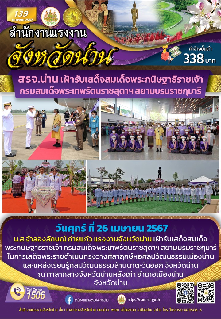 น.ส.จำลองลักษณ์ ก่ายแก้ว แรงงานจังหวัดน่าน เฝ้ารับเสด็จสมเด็จพระกนิษฐาธิราชเจ้า กรมสมเด็จพระเทพรัตนราชสุดาฯ สยามบรมราชกุมารี ในการเสด็จพระราชดำเนินทรงวางศิลาฤกษ์หอศิลปวัฒนธรรมเมืองน่าน และแหล่งเรียนรู้ศิลปวัฒนธรรมล้านนาตะวันออก จังหวัดน่าน ณ ศาลากลางจังหวัดน่านหลังเก่า อำเภอเมืองน่าน จังหวัดน่าน