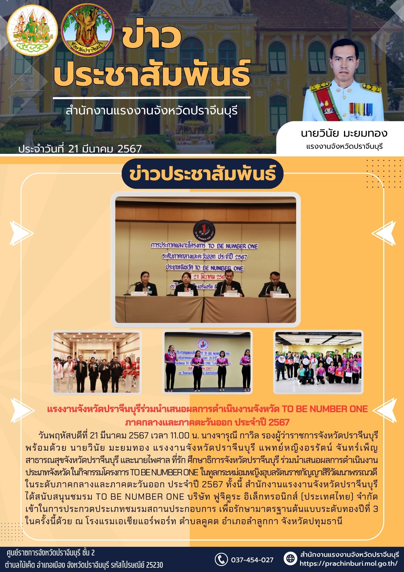วันพฤหัสบดีที่ 21 มีนาคม 2567 เวลา 11.00 น. นางจารุณี กาวิล รองผู้ว่าราชการจังหวัดปราจีนบุรี พร้อมด้วย นายวินัย มะยมทอง แรงงานจังหวัดปราจีนบุรี แพทย์หญิงอรรัตน์ จันทร์เพ็ญ สาธารณสุขจังหวัดปราจีนบุรี และนายไพศาล ที่รัก ศึกษาธิการจังหวัดปราจีนบุรี ร่วมนำเสนอผลการดำเนินงานประเภทจังหวัด ในกิจกรรมโครงการ TO BE NUMBER ONE ในทูลกระหม่อมหญิงอุบลรัตนราชกัญญาสิริวัฒนาพรรณวดีในระดับภาคกลางและภาคตะวันออก ประจำปี 2567 ทั้งนี้ สำนักงานแรงงานจังหวัดปราจีนบุรีได้สนับสนุนชมรม TO BE NUMBER ONE บริษัท ฟูจิคูระ อิเล็กทรอนิกส์ (ประเทศไทย) จำกัด เข้าในการประกวดประเภทชมรมสถานประกอบการ เพื่อรักษามาตรฐานต้นแบบระดับทองปีที่ 3 ในครั้งนี้ด้วย ณ โรงแรมเอเชียแอร์พอร์ท ตำบลคูคต อำเภอลำลูกกา จังหวัดปทุมธานี