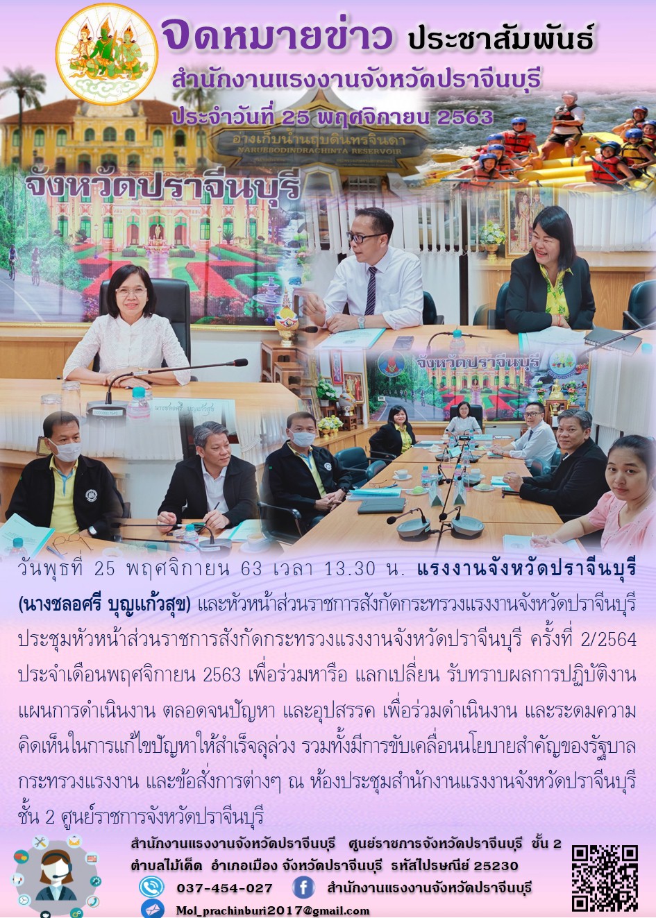 วันพุธที่ 25 พฤศจิกายน 63 เวลา 13.30 น. แรงงานจังหวัดปราจีนบุรี (นางชลอศรี บุญแก้วสุข) และหัวหน้าส่วนราชการสังกัดกระทรวงแรงงานจังหวัดปราจีนบุรี ประชุมหัวหน้าส่วนราชการสังกัดกระทรวงแรงงานจังหวัดปราจีนบุรี ครั้งที่ 2/2564 ประจำเดือนพฤศจิกายน 2563 เพื่อร่วมหารือ แลกเปลี่ยน รับทราบผลการปฏิบัติงาน แผนการดำเนินงาน ตลอดจนปัญหา และอุปสรรค เพื่อร่วมดำเนินงาน และระดมความคิดเห็นในการแก้ไขปัญหาให้สำเร็จลุล่วง รวมทั้งมีการขับเคลื่อนนโยบายสำคัญของรัฐบาล กระทรวงแรงงาน และข้อสั่งการต่างๆ ณ ห้องประชุมสำนักงานแรงงานจังหวัดปราจีนบุรี ชั้น 2 ศูนย์ราชการจังหวัดปราจีนบุรี