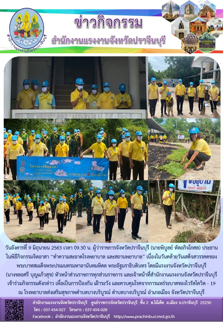 วันอังคารที่ 9 มิถุนายน 2563 เวลา 09.30 น. ผู้ว่าราชการจังหวัดปราจีนบุรี (นายพิบูลย์ หัตถกิจโกศล) ประธานในพิธีกิจกรรมจิตอาสา “ทำความสะอาดโรงพยาบาล และสถานพยาบาล” เนื่องในวันคล้ายวันเสด็จสวรรคตของพระบาทสมเด็จพระปรเมนทรมหาอานันทมหิดล พระอัฐมราธิบดินทร โดยมี แรงงานจังหวัดปราจีนบุรี (นางชลอศรี บุญแก้วสุข) หัวหน้าส่วนราชการทุกส่วนราชการ และเจ้าหน้าที่สำนักงานแรงงานจังหวัดปราจีนบุรี เข้าร่วมกิจกรรมดังกล่าว เพื่อเป็นการป้องกัน เฝ้าระวัง และควบคุมโรคจากการแพร่ระบาดของไวรัสโควิด – 19 ณ โรงพยาบาลส่งเสริมสุขภาพตำบลบางบริบูรณ์ ตำบลบางบริบูรณ์ อำเภอเมือง จังหวัดปราจีนบุรี