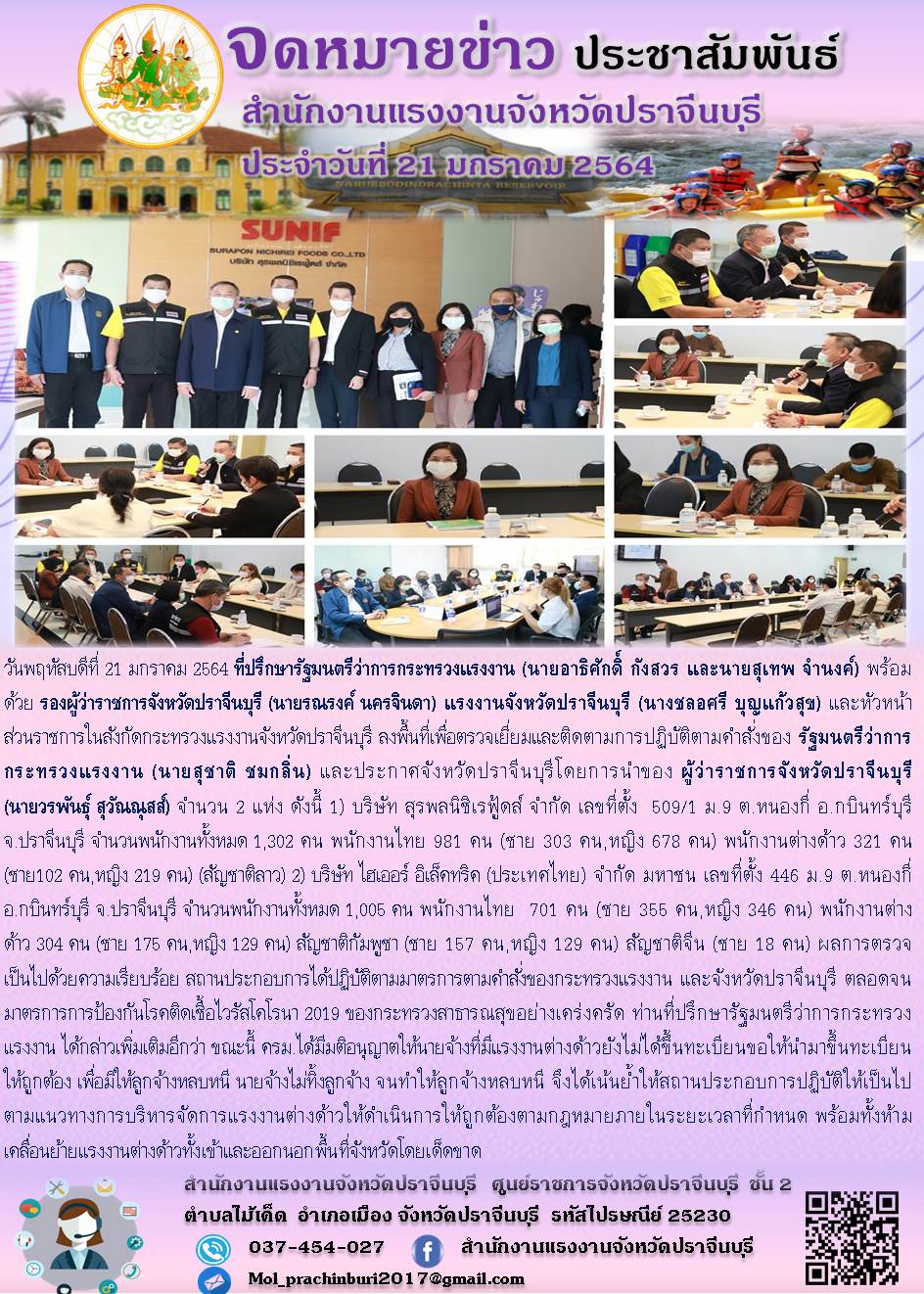 วันพฤหัสบดีที่ 21 มกราคม 2564 เวลา 10.00 -12.00 น. รัฐมนตรีว่าการกระทรวงแรงงาน (นายสุชาติ ชมกลิ่น) มอบหมาย ที่ปรึกษารัฐมนตรีว่าการกระทรวงแรงงาน (นายอาธิศักดิ์ กังสวร และ นายสุเทพ จำนงค์) และ ผู้ว่าราชการจังหวัดปราจีนบุรี (นายวรพันธุ์ สุวัณณุสส์) มอบหมาย รองผู้ว่าราชการจังหวัดปราจีนบุรี (นายรณรงค์ นครจินดา) พร้อมหัวหน้าหน่วยงานสังกัดกระทรวงแรงงานจังหวัดปราจีนบุรี ประกอบด้วย แรงงานจังหวัดปราจีนบุรี (นางชลอศรี บุญแก้วสุข) นายชัยวัฒน์ อางคาสัย สวัสดิการและคุ้มครองแรงงานจังหวัดปราจีนบุรี นางสาวพรพิไล มะลอย ประกันสังคมจังหวัดปราจีนบุรี นายสิทธิชัย วารีชนานนท์ จัดหางานจังหวัดปราจีนบุรี และนางสาววนิดา เงินรูปงาม ผู้อำนวยการสำนักงานพัฒนาฝีมือแรงงานปราจีนบุรี ลงพื้นที่เพื่อตรวจเยี่ยม และติดตามการปฏิบัติตามคำสั่งของรัฐมนตรีว่าการกระทรวงแรงงาน และประกาศจังหวัดปราจีนบุรี จำนวน 2 แห่ง คือ