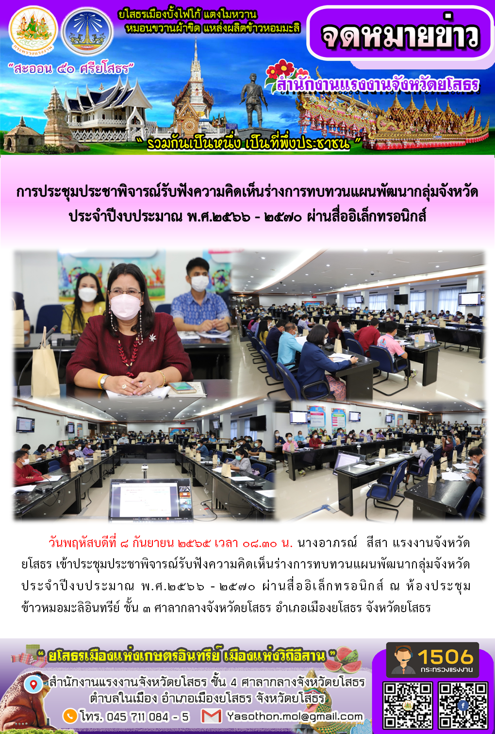แรงงานจังหวัดยโสธร เข้าร่วมการประชุมประชาพิจารณ์รับฟังความคิดเห็นร่างการทบทวนแผนพัฒนากลุ่มจังหวัดประจำปีงบประมาณ พ.ศ.2566 – 2570 ผ่านสื่ออิเล็กทรอนิกส์