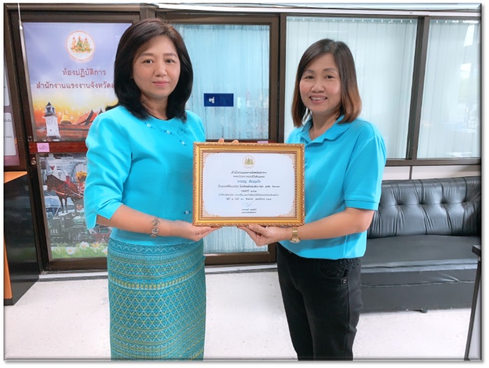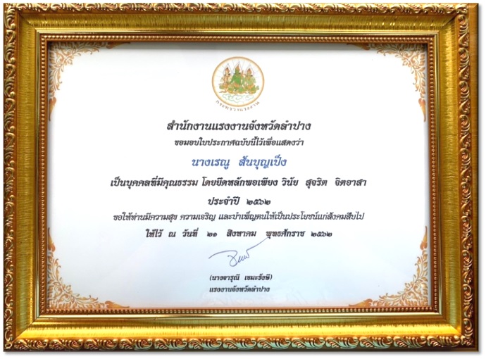 วันนี้ (๒๓ ส.ค. ๖๒) นางจารุณี เขมะรังษี แรงงานจังหวัดลำปาง มอบใบประกาศเชิดชูเกียรติบุคคลในองค์กรที่มีคุณธรรมของสำนักงานแรงงานจังหวัดลำปางให้แก่นางเรณู สันบุญเป็ง ตำแหน่ง เจ้าพนักงานการเงินและบัญชีชำนาญงาน โดยเป็นบุคคลที่มีความประพฤติปฏิบัติที่ดียึดมั่นในคุณธรรมจริยธรรมในการดำเนินชีวิตและการปฏิบัติงาน ตามหลักคุณธรรม ๔ ประการ (ด้านพอเพียง ด้านวินัย ด้านสุจริต และด้านจิตอาสา) ณ ห้องสำนักงานแรงงานจังหวัดลำปาง (ชั้น ๒) ศาลากลางจังหวัดลำปาง ตำบลพระบาท อำเภอเมืองลำปาง จังหวัดลำปาง
