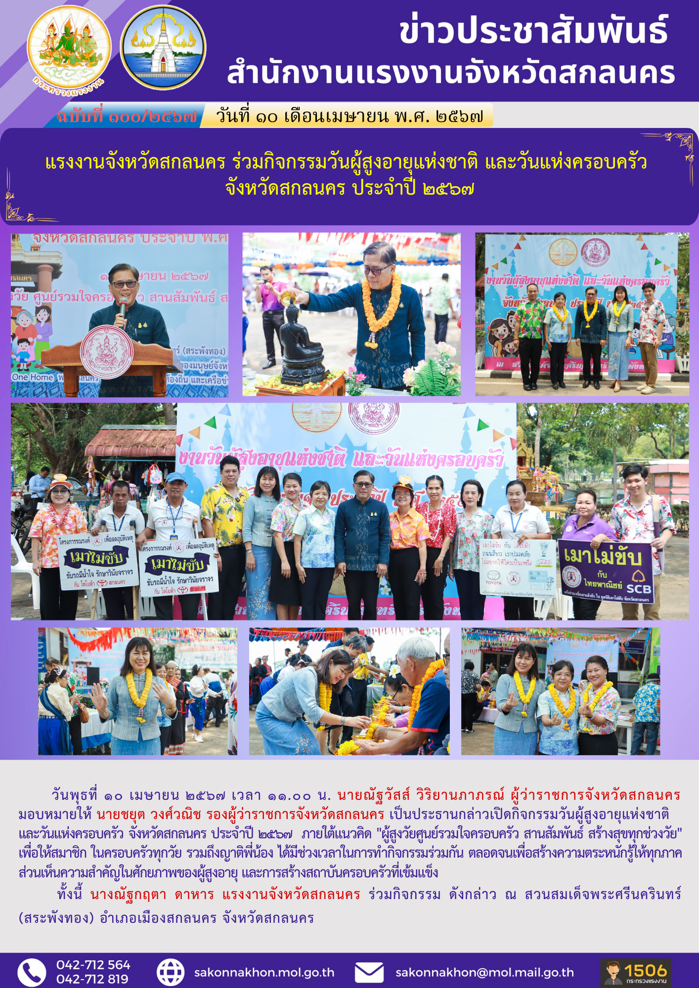 แรงงานจังหวัดสกลนคร ร่วมกิจกรรมวันผู้สูงอายุแห่งชาติ และวันแห่งครอบครัว จังหวัดสกลนคร ประจำปี 2567