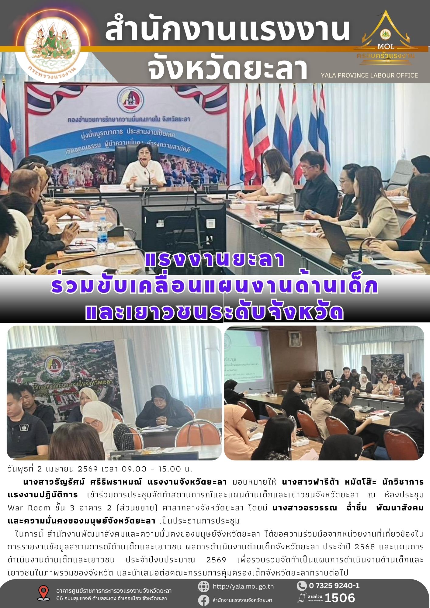 แรงงานยะลา ร่วมขับเคลื่อนแผนงานด้านเด็กและเยาวชนระดับจังหวัด