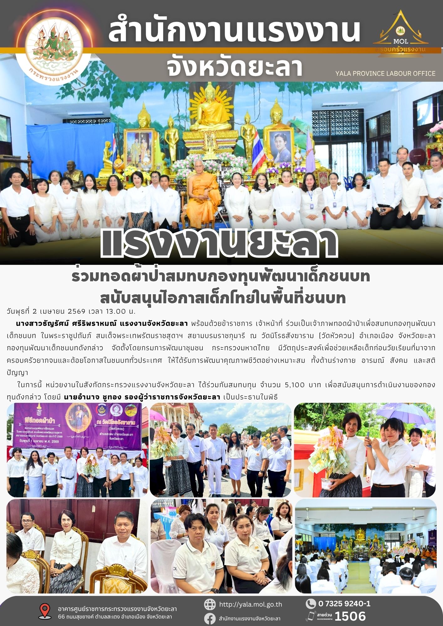 แรงงานยะลา ร่วมทอดผ้าป่าสมทบกองทุนพัฒนาเด็กชนบท สนับสนุนโอกาสเด็กไทยในพื้นที่ชนบท
