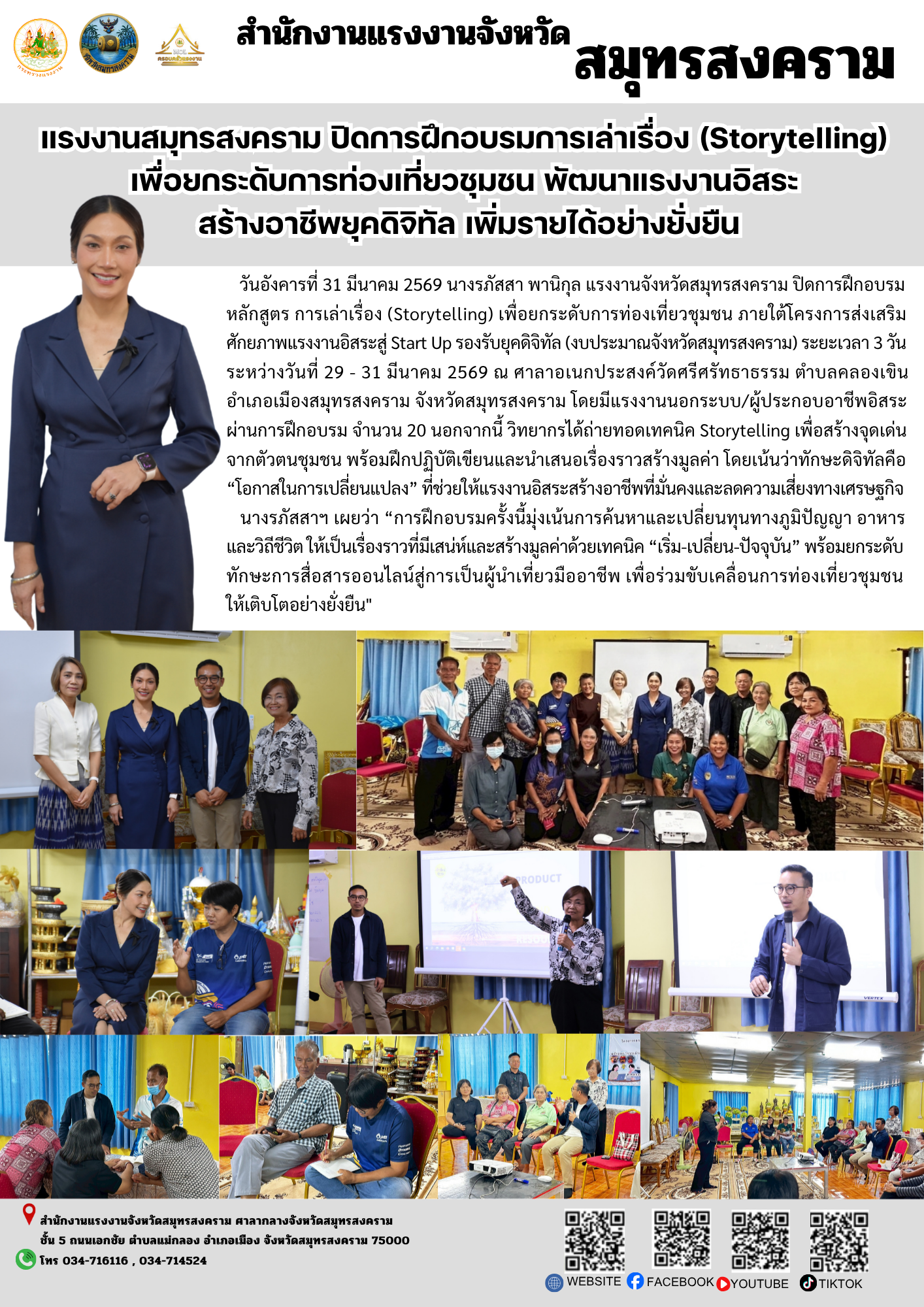 แรงงานสมุทรสงคราม ปิดการฝึกอบรมการเล่าเรื่อง (Storytelling) เพื่อยกระดับการท่องเที่ยวชุมชน พัฒนาแรงงานอิสระ สร้างอาชีพยุคดิจิทัล เพิ่มรายได้อย่างยั่งยืน