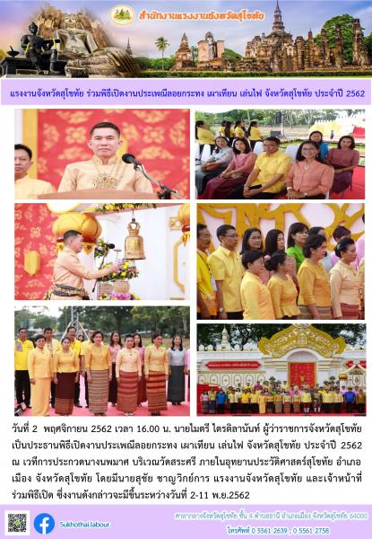 แรงงานจังหวัดสุโขทัย ร่วมพิธีเปิดงานประเพณีลอยกระทง เผาเทียน เล่นไฟ จังหวัดสุโขทัย ประจำปี 2562