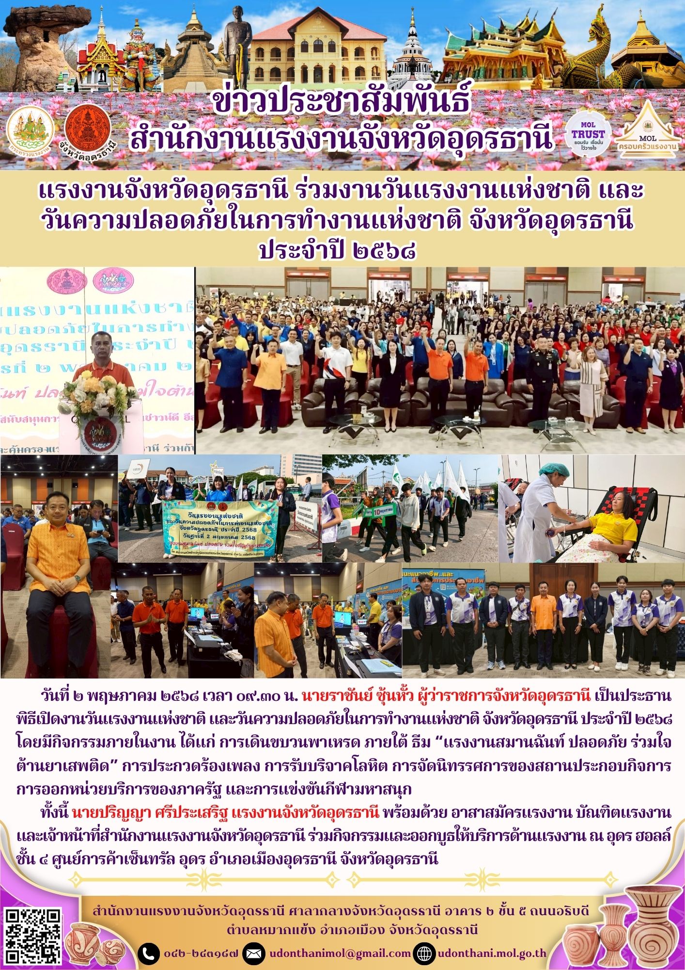 แรงงานจังหวัดอุดรธานี ร่วมงานวันแรงงานแห่งชาติ และวันความปลอดภัยในการทำงานแห่งชาติจังหวัดอุดรธานี ประจำปี ๒๕๖๘