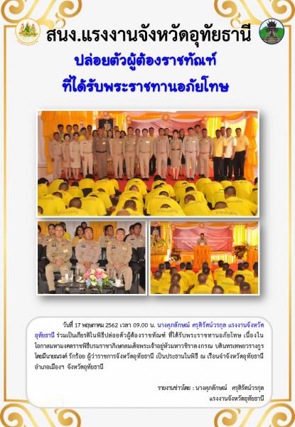 แรงงานจังหวัดอุทัยธานี ร่วมเป็นพิธีปล่อยตัวผู้ต้องราชทัณฑ์ ที่ได้รับพระราชทานอภัยโทษ เนื่องในโอกาสมหามงคลราชพิธีบรมราชาพิเษกฯ ณ เรือนจำจังหวัดอุทัยธานี