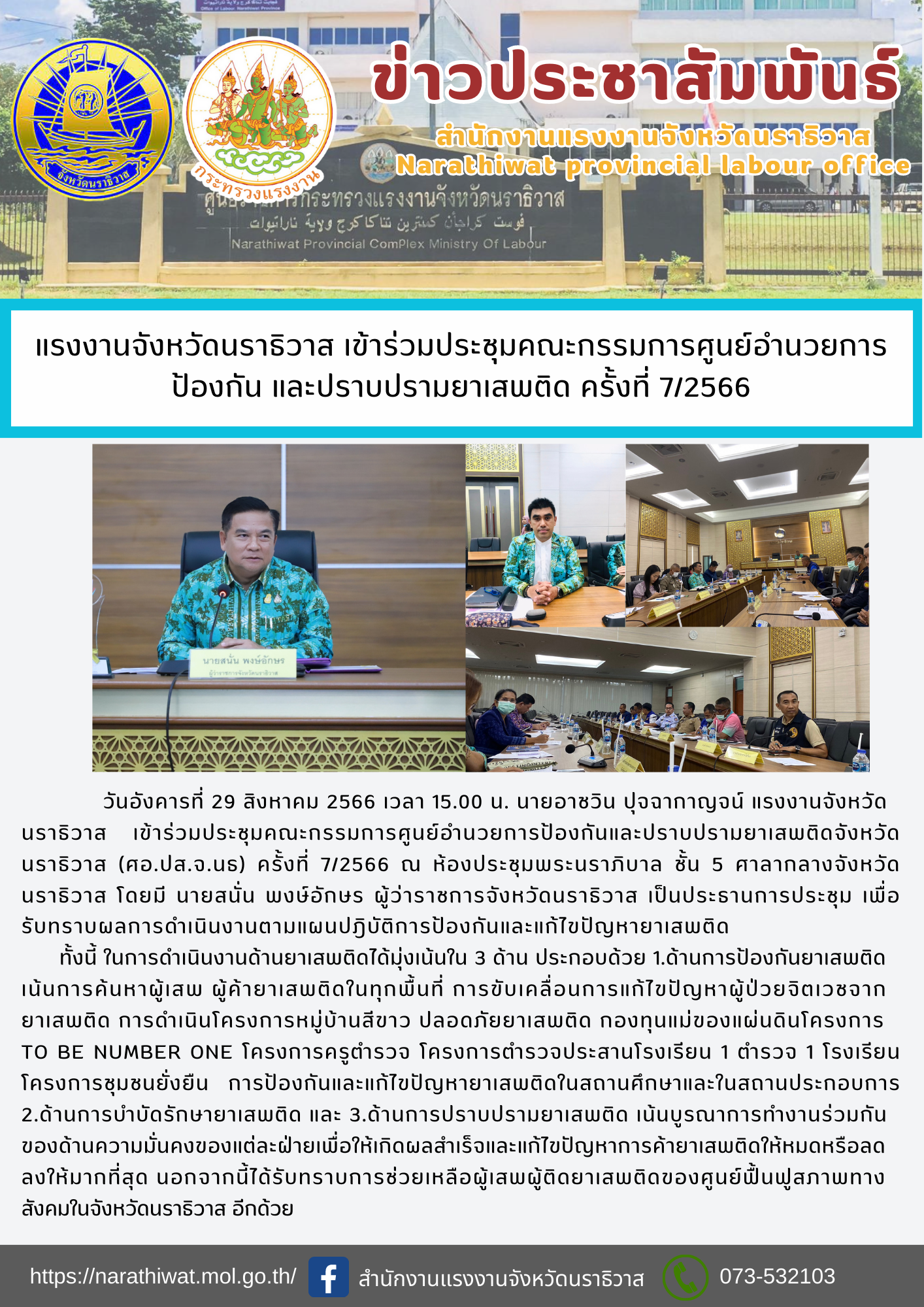 วันอังคารที่ 29 สิงหาคม 2566 เวลา 15.00 น. นายอาชวิน ปุจฉากาญจน์ แรงงานจังหวัดนราธิวาส เข้าร่วมประชุมคณะกรรมการศูนย์อำนวยการป้องกันและปราบปรามยาเสพติดจังหวัดนราธิวาส (ศอ.ปส.จ.นธ) ครั้งที่ 7/2566 ณ ห้องประชุมพระนราภิบาล ชั้น 5 ศาลากลางจังหวัดนราธิวาส โดยมี นายสนั่น พงษ์อักษร ผู้ว่าราชการจังหวัดนราธิวาส เป็นประธานการประชุม เพื่อรับทราบผลการดำเนินงานตามแผนปฎิบัติการป้องกันและแก้ไขปัญหายาเสพติด