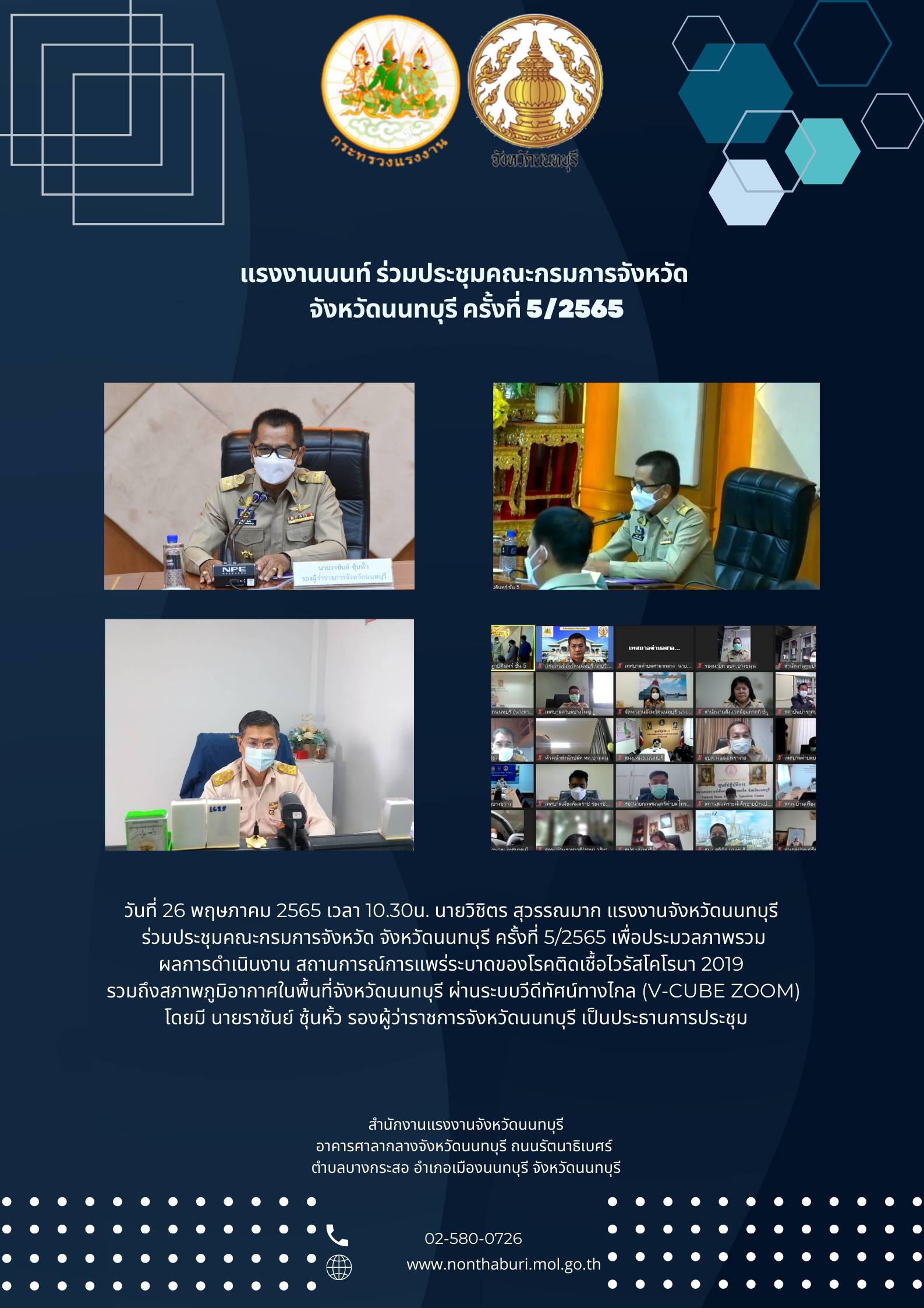 วันที่ 26 พฤษภาคม 2565 เวลา 10.30น. นายวิชิตร สุวรรณมาก แรงงานจังหวัดนนทบุรี ร่วมประชุมคณะกรมการจังหวัด จังหวัดนนทบุรี ครั้งที่ 5/2565 เพื่อประมวลภาพรวมผลการดำเนินงาน สถานการณ์การแพร่ระบาดของโรคติดเชื้อไวรัสโคโรนา 2019 รวมถึงสภาพภูมิอากาศในพื้นที่จังหวัดนนทบุรี ผ่านระบบวีดีทัศน์ทางไกล (V-CUBE ZOOM) โดยมี นายราชันย์ ซุ้นหั้ว รองผู้ว่าราชการจังหวัดนนทบุรี เป็นประธานการประชุม