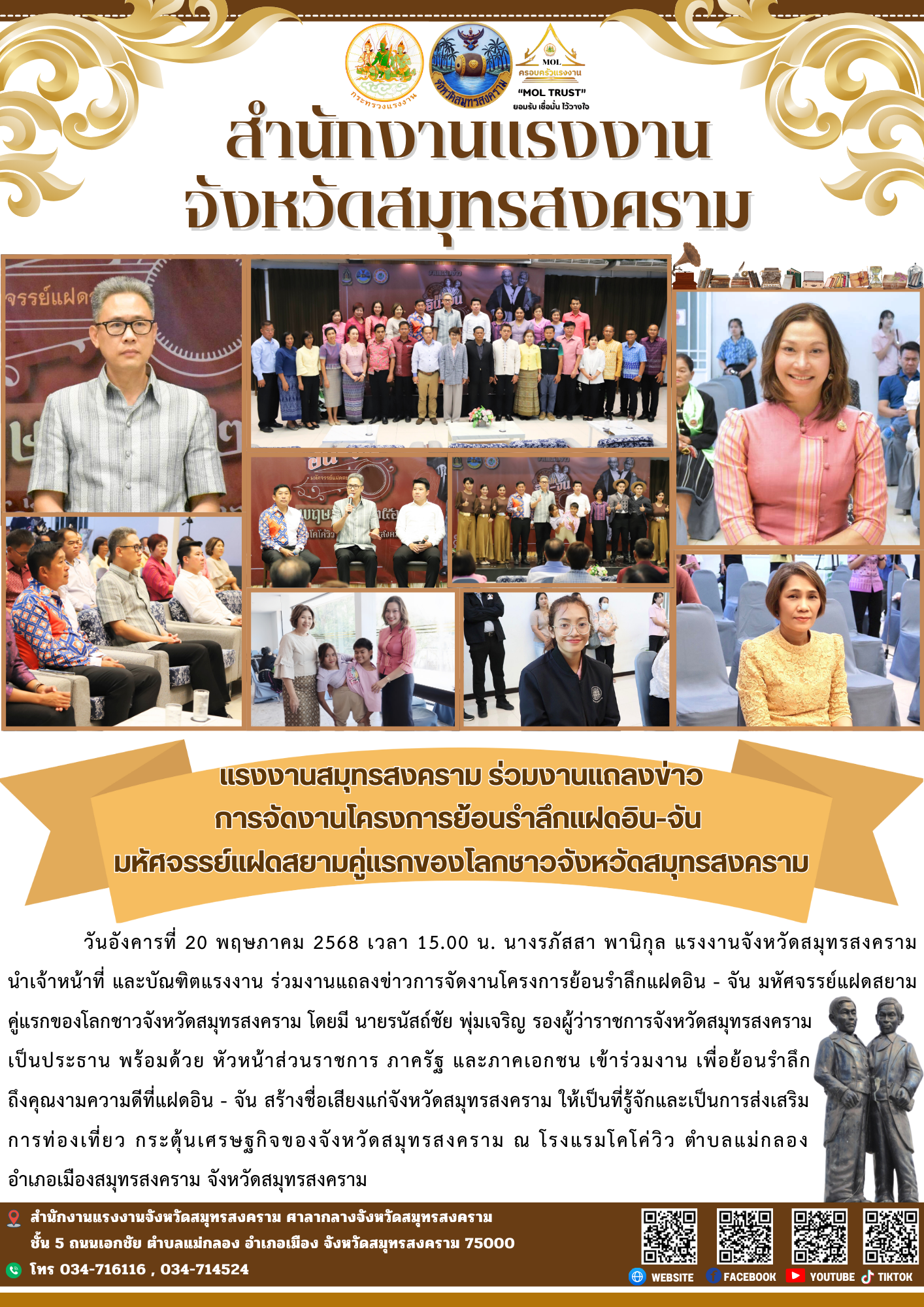 แรงงานสมุทรสงคราม ร่วมงานแถลงข่าว การจัดงานโครงการย้อนรำลึกแฝดอิน-จัน มหัศจรรย์แฝดสยามคู่แรกของโลกชาวจังหวัดสมุทรสงคราม