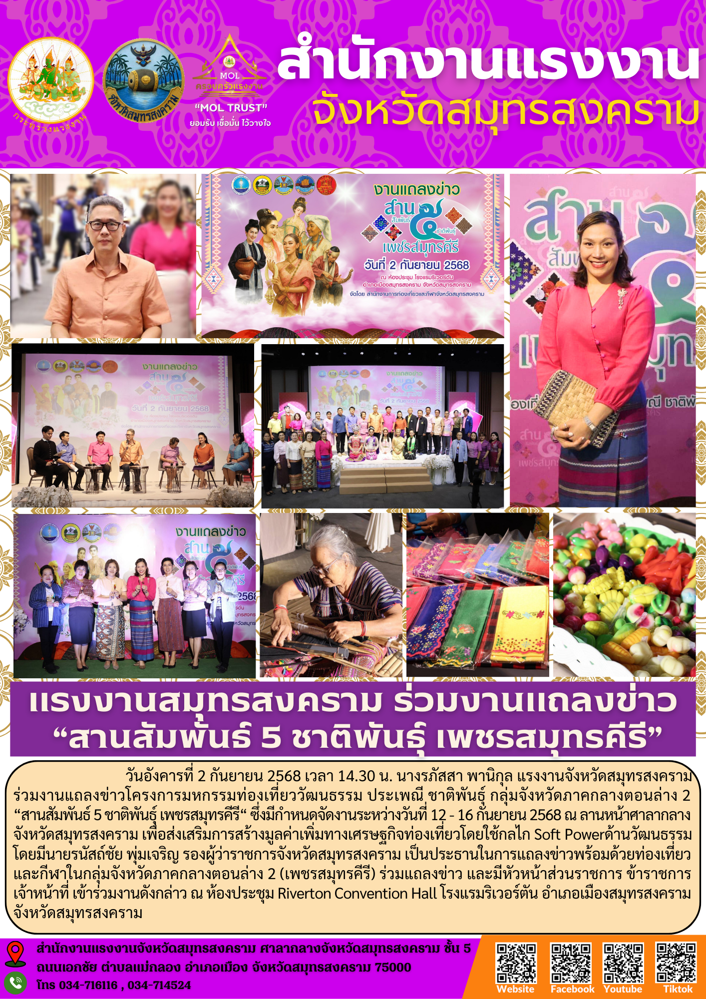 วันอังคารที่ 2 กันยายน 2568 เวลา 14.30 น. นางรภัสสา พานิกุล แรงงานจังหวัดสมุทรสงคราม ร่วมงานแถลงข่าวโครงการมหกรรมท่องเที่ยววัฒนธรรม ประเพณี ชาติพันธุ์ กลุ่มจังหวัดภาคกลางตอนล่าง 2 “สานสัมพันธ์ 5 ชาติพันธุ์ เพชรสมุทรคีรี“ ซึ่งมีกำหนดจัดงานระหว่างวันที่ 12 – 16 กันยายน 2568 ณ ลานหน้าศาลากลางจังหวัดสมุทรสงคราม เพื่อส่งเสริมการสร้างมูลค่าเพิ่มทางเศรษฐกิจท่องเที่ยวโดยใช้กลไก Soft Power ด้านวัฒนธรรม โดยมีนายรนัสถ์ชัย พุ่มเจริญ รองผู้ว่าราชการจังหวัดสมุทรสงคราม เป็นประธานในการแถลงข่าว พร้อมด้วยท่องเที่ยวและกีฬาในกลุ่มจังหวัดภาคกลางตอนล่าง 2 (เพชรสมุทรคีรี) ร่วมแถลงข่าว และมีหัวหน้าส่วนราชการ ข้าราชการ เจ้าหน้าที่ เข้าร่วมงานดังกล่าว ณ ห้องประชุม Riverton Convention Hall โรงแรมริเวอร์ตัน อำเภอเมืองสมุทรสงคราม จังหวัดสมุทรสงคราม