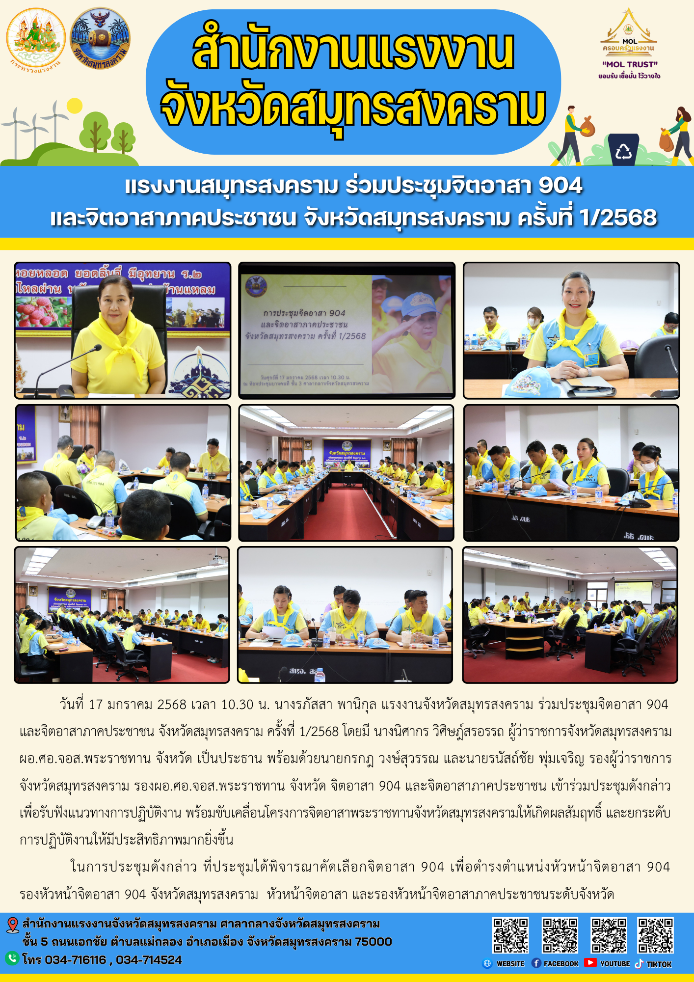 วันที่ 17 มกราคม 2568 เวลา 10.30 น. นางรภัสสา พานิกุล แรงงานจังหวัดสมุทรสงคราม ร่วมประชุมจิตอาสา 904 และจิตอาสาภาคประชาชน จังหวัดสมุทรสงคราม ครั้งที่ 1/2568 โดยมี นางนิศากร วิศิษฎ์สรอรรถ ผู้ว่าราชการจังหวัดสมุทรสงคราม ผอ.ศอ.จอส.พระราชทาน จังหวัด เป็นประธาน พร้อมด้วยนายกรกฎ วงษ์สุวรรณ และนายรนัสถ์ชัย พุ่มเจริญ รองผู้ว่าราชการจังหวัดสมุทรสงคราม รองผอ.ศอ.จอส.พระราชทาน จังหวัด จิตอาสา 904 และจิตอาสาภาคประชาชน เข้าร่วมประชุมดังกล่าว เพื่อรับฟังแนวทางการปฏิบัติงาน พร้อมขับเคลื่อนโครงการจิตอาสาพระราชทานจังหวัดสมุทรสงครามให้เกิดผลสัมฤทธิ์ และยกระดับการปฏิบัติงานให้มีประสิทธิภาพมากยิ่งขึ้น