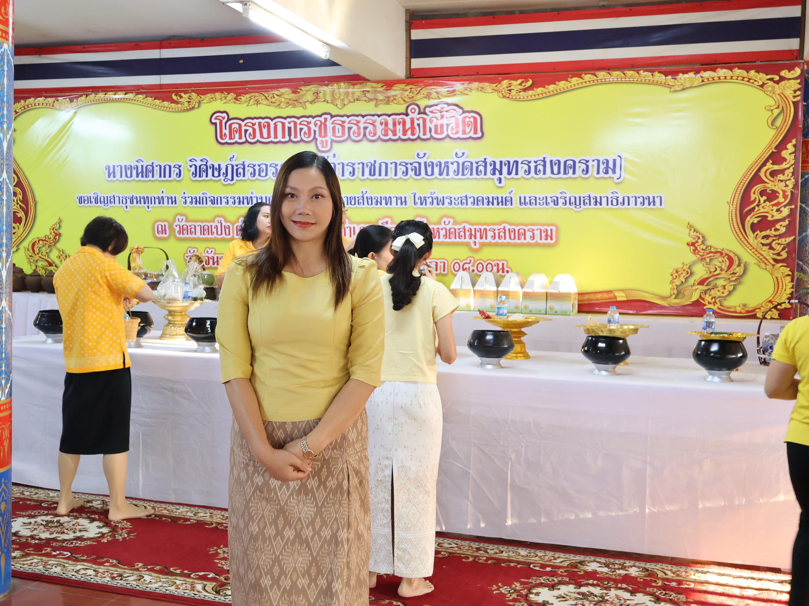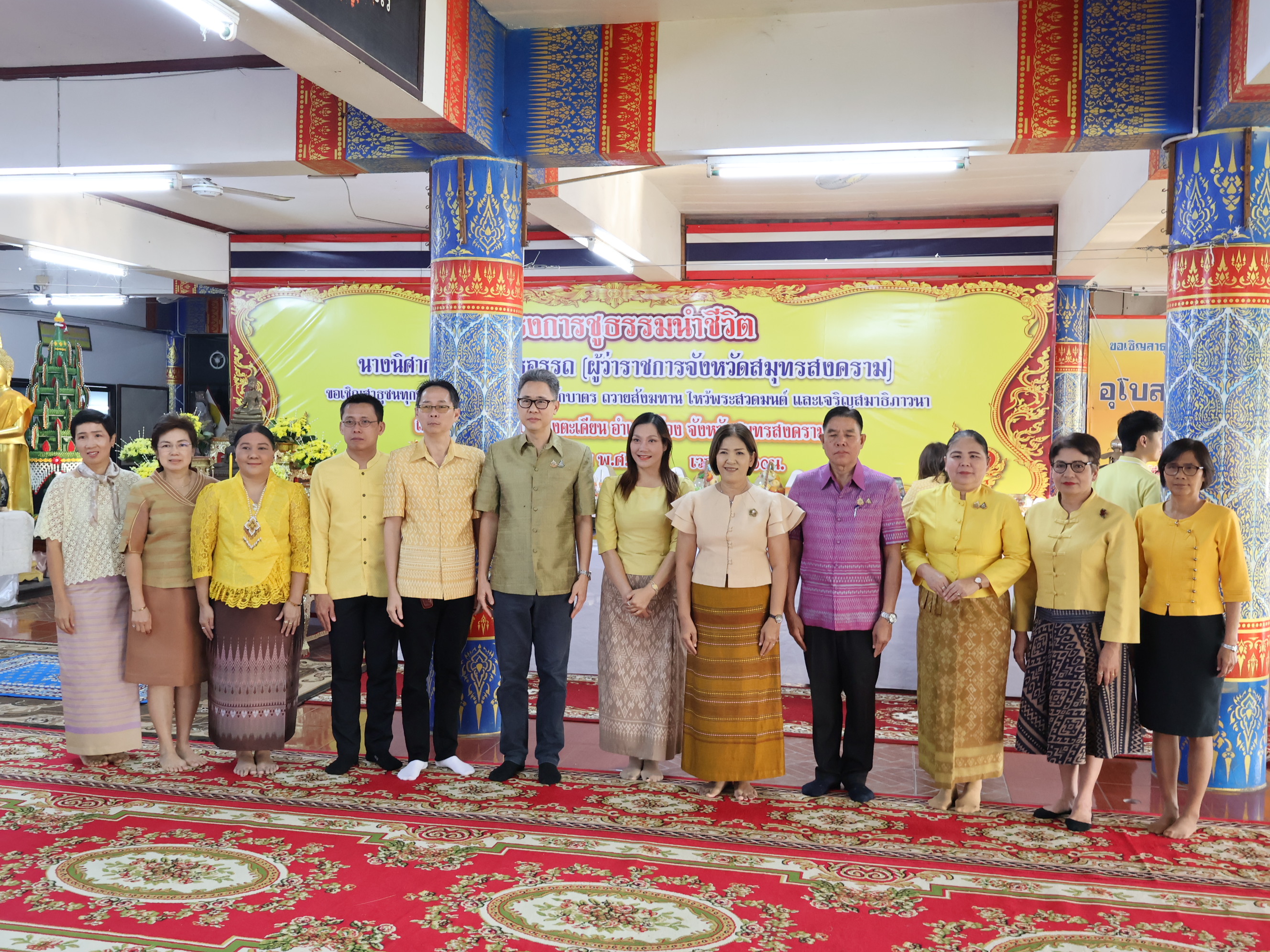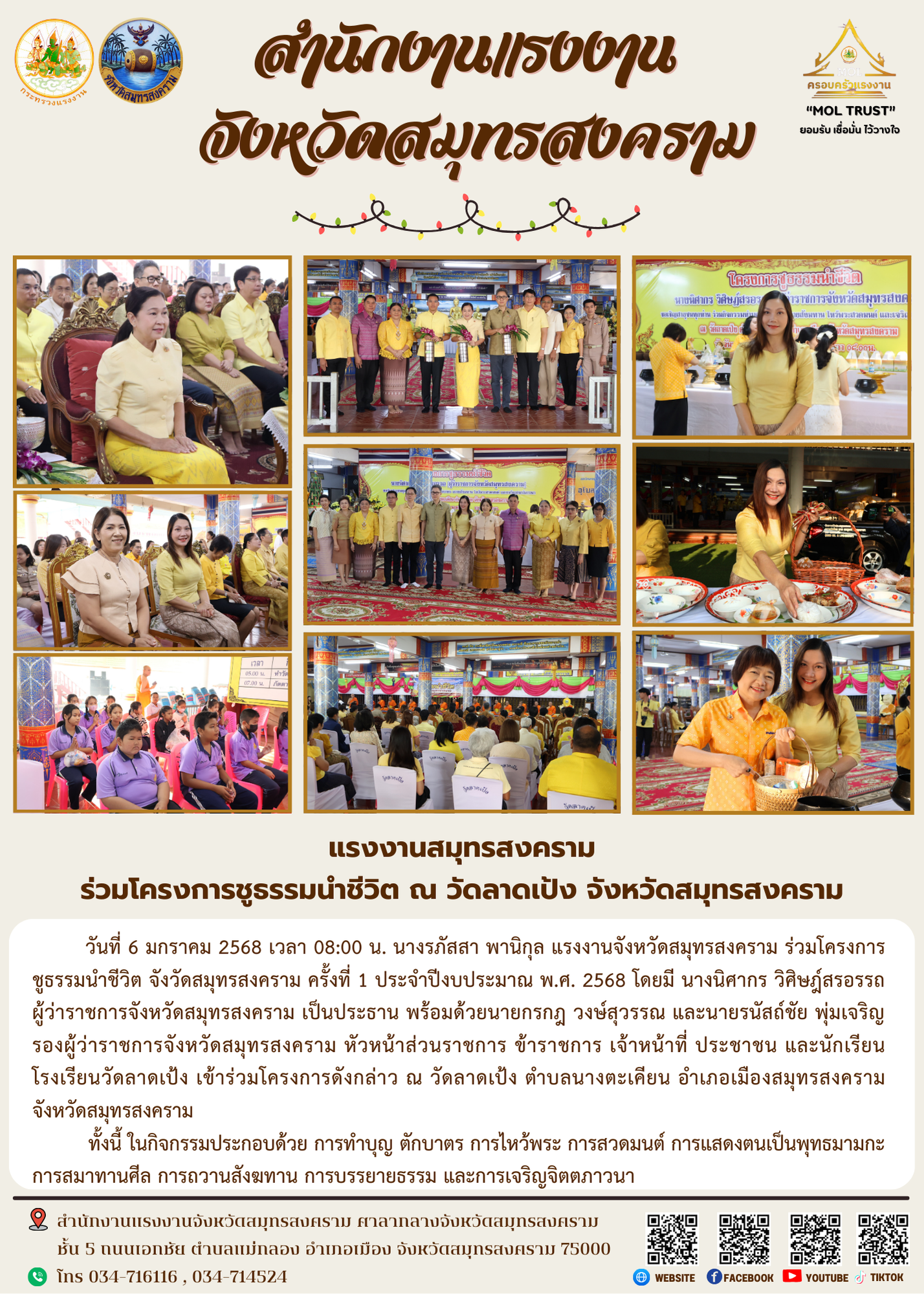 วันที่ 6 มกราคม 2568 เวลา 08:00 น. นางรภัสสา พานิกุล แรงงานจังหวัดสมุทรสงคราม ร่วมโครงการชูธรรมนำชีวิต จังวัดสมุทรสงคราม ครั้งที่ 1 ประจำปีงบประมาณ พ.ศ. 2568 โดยมี นางนิศากร วิศิษฎ์สรอรรถ ผู้ว่าราชการจังหวัดสมุทรสงคราม เป็นประธาน พร้อมด้วยนายกรกฎ วงษ์สุวรรณ และนายรนัสถ์ชัย พุ่มเจริญ รองผู้ว่าราชการจังหวัดสมุทรสงคราม หัวหน้าส่วนราชการ ข้าราชการ เจ้าหน้าที่ ประชาชน และนักเรียนโรงเรียนวัดลาดเป้ง เข้าร่วมโครงการดังกล่าว ณ วัดลาดเป้ง ตำบลนางตะเคียน อำเภอเมืองสมุทรสงคราม จังหวัดสมุทรสงคราม