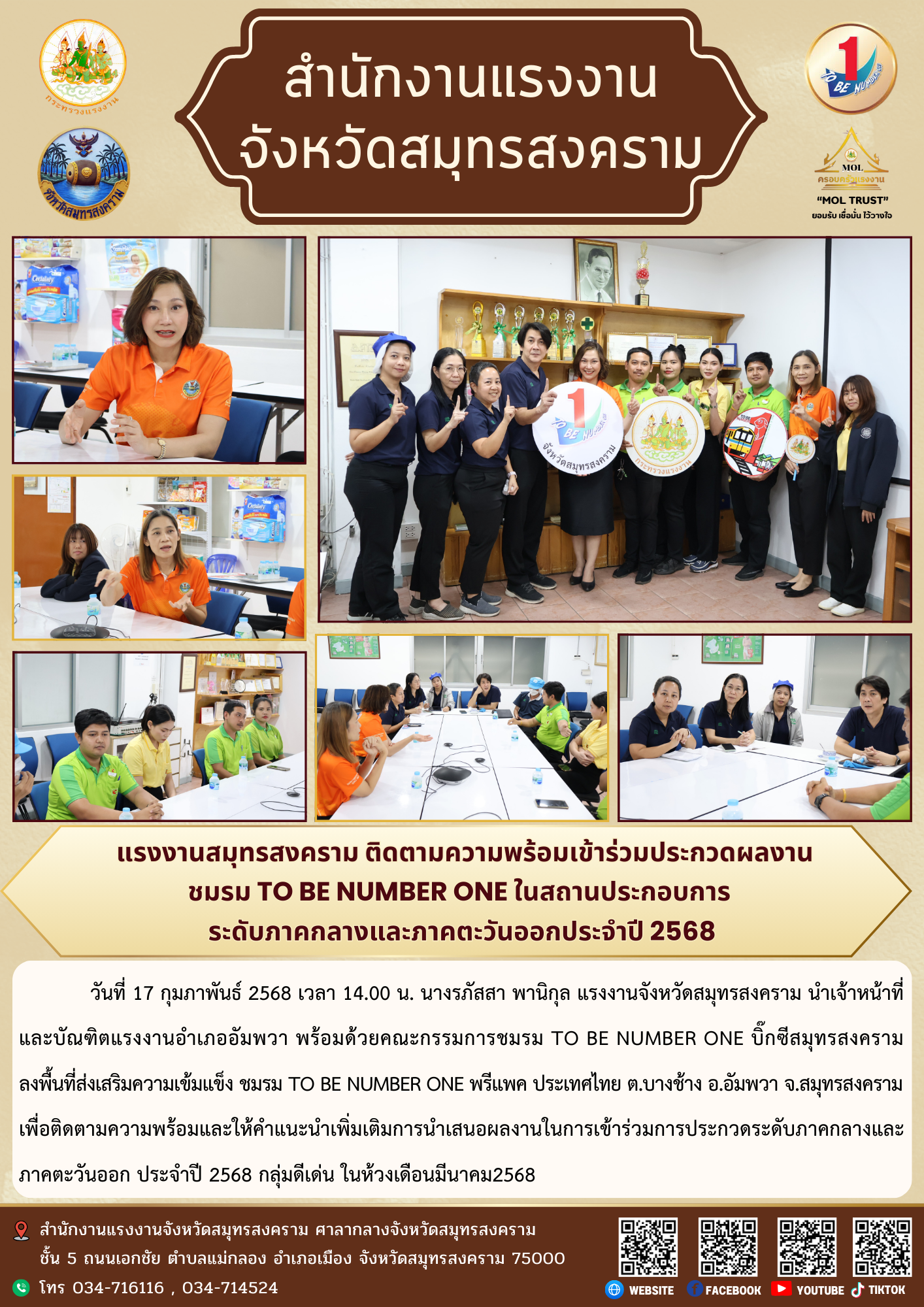 วันที่ 17 กุมภาพันธ์ 2568 เวลา 10.00 น. นางรภัสสา พานิกุล แรงงานจังหวัดสมุทรสงคราม นำเจ้าหน้าที่ บัณฑิตแรงงานอำเภออัมพวา และคณะกรรมการชมรม TO BE NUMBER ONE BIG C สมุทรสงคราม ลงพื้นที่ชวน บริษัท อีซูซุสงวนไทยมอเตอร์เซลล์ จำกัด จัดตั้ง “ ชมรม TO BE NUMBER ONE ในสถานประกอบการ ” พร้อมให้คำปรึกษาและข้อแนะนำสำหรับการดำเนินกิจกรรมในสถานประกอบการ ณ บริษัท อีซูซุสงวนไทยมอเตอร์เซลล์ จำกัด ต.แม่กลอง อ.เมืองสมุทรสงคราม จ.สมุทรสงคราม
