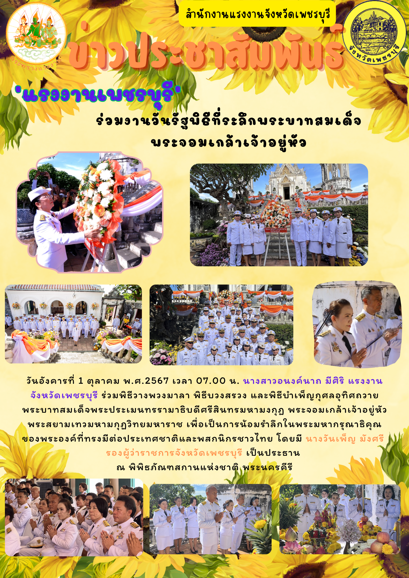 วันอังคารที่ 1 ตุลาคม พ.ศ.2567 เวลา 07.00 น. นางสาวอนงค์นาถ มีศิริ แรงงานจังหวัดเพชรบุรี ร่วมพิธีวางพวงมาลา พิธีบวงสรวง และพิธีบำเพ็ญกุศลอุทิศถวายพระบากสมเด็จพระประเมนทรรามาธิบดีศรีสินทรมหามงกุฏ พระจอมเกล้าเจ้าอยู่หัวพระสยามเทวมหามกุฏวิทยมหาราช เพื่อเป็นการน้อมรำลึกในพระมหากรุณาธิคุณของพระองค์ที่ทรงมีต่อประเทศชาติและพสกนิกรชาวไทย โดยมี นางวันเพ็ญ มังศรี รองผู้ว่าราชการจังหวัดเพชรบุรี เป็นประธาน ณ พิพิธภัณฑสกานแห่งชาติ พระนครคีรี