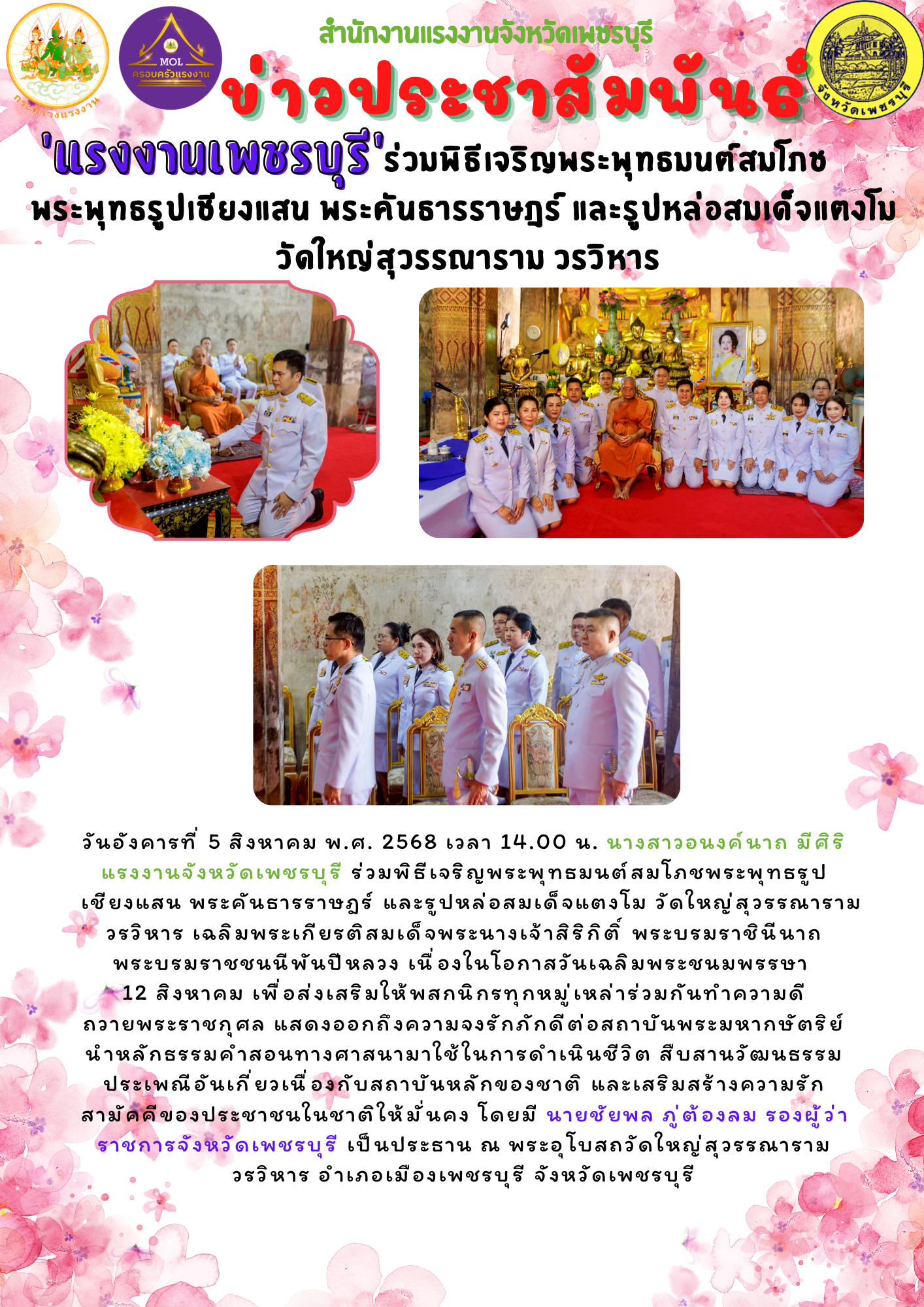 วันอังคารที่ 5 สิงหาคม พ.ศ. 2568 เวลา 14.00 น. นางสาวอนงค์นาถ มีศิริ แรงงานจังหวัดเพชรบุรี ร่วมพิธีเจริญพระพุทธมนต์สมโภชพระพุทธรูปเชียงแสน พระคันธารราษฎร์ และรูปหล่อสมเด็จแตงโม วัดใหญ่สุวรรณาราม วรวิหาร เฉลิมพระเกียรติสมเด็จพระนางเจ้าสิริกิติ์ พระบรมราชินีนาถ พระบรมราชชนนีพันปีหลวง เนื่องในโอกาสวันเฉลิมพระชนมพรรษา 12 สิงหาคม เพื่อส่งเสริมให้พสกนิกรทุกหมู่เหล่าร่วมกันทำความดีถวายพระราชกุศล แสดงออกถึงความจงรักภักดีต่อสถาบันพระมหากษัตริย์ นำหลักธรรมคำสอนทางศาสนามาใช้ในการดำเนินชีวิต สืบสานวัฒนธรรมประเพณีอันเกี่ยวเนื่องกับสถาบันหลักของชาติ และเสริมสร้างความรักสามัคคีของประชาชนในชาติให้มั่นคง โดยมี นายชัยพล ภู่ต้องลม รองผู้ว่าราชการจังหวัดเพชรบุรี เป็นประธาน ณ พระอุโบสถวัดใหญ่สุวรรณาราม วรวิหาร อำเภเมืองเพชรบุรี จังหวัดเพชรบุรี