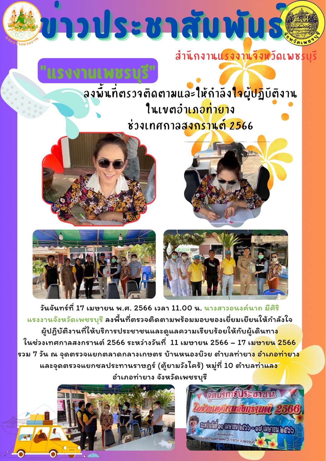 วันจันทร์ที่ 17 เมษายน พ.ศ. 2566 เวลา 11.00 น. นางสาวอนงค์นาถ มีศิริ แรงงานจังหวัดเพชรบุรี ลงพื้นที่ตรวจติดตามพร้อมมอบของเยี่ยมเยียนให้กำลังใจผู้ปฏิบัติงานที่ให้บริการประชาชนและดูแลความเรียบร้อยให้กับผู้เดินทางในช่วงเทศกาลสงกรานต์ 2566 ระหว่างวันที่ 11 เมษายน 2566 – 17 เมษายน 2566 รวม 7 วัน ณ จุดตรวจแยกตลาดกลางเกษตร บ้านหนองบ๊วย ตำบลท่ายาง อำเภอท่ายางและจุดตรวจแยกชลประทานราษฎร์ (ตู้ยามวังไคร้) หมู่ที่ 10 ตำบลท่าแลง อำเภอท่ายาง จังหวัดเพชรบุรี
