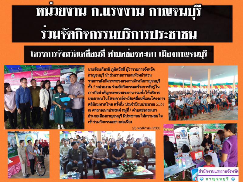 หน่วยงาน กระทรวงแรงงาน กาญจนบุรี ร่วมจัดกิจกรรมบริการประชาชน ในโครงการจังหวัดเคลื่อน ที่ตำบลช่องสะเดา เมืองกาญจนบุรี โดยมีนายจีระเกียรติ ภูมิสวัสดิ์ ผู้ว่าราชการจังหวัดกาญจนบุรีเป็นประธานในพิธีเปิด