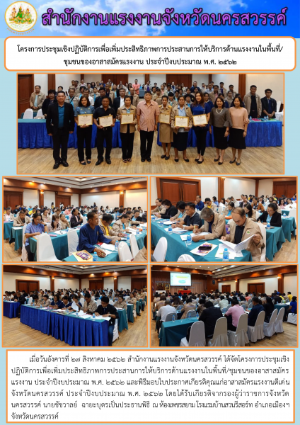 เมื่อวันอังคารที่ 27 สิงหาคม 2562 สำนักงานแรงงานจังหวัดนครสวรรค์ ได้จัดโครงการประชุมเชิงปฏิบัติการเพื่อเพิ่มประสิทธิภาพการประสานการให้บริการด้านแรงงานในพื้นที่/ชุมชนของอาสาสมัครแรงงาน ประจำปีงบประมาณ พ.ศ. 2562 และพิธีมอบใบประกาศเกียรติคุณแก่อาสาสมัครแรงงานดีเด่นจังหวัดนครสวรรค์ ประจำปีงบประมาณ พ.ศ. 2562 โดยได้รับเกียรติจากรองผู้ว่าราชการจังหวัดนครสวรรค์ นายชัชวาลย์ ฉายะบุตร เป็นประธานพิธี ณ ห้องเพชรสยาม โรงแรมบ้านสวนรีสอร์ท อำเภอเมืองฯ จังหวัดนครสวรรค์