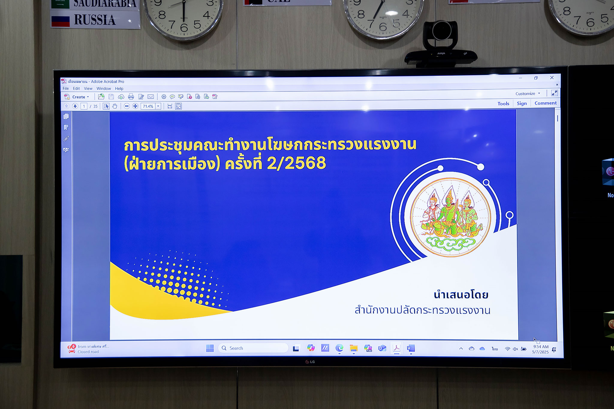 วันที่ 7 พฤษภาคม 2568 เวลา 10.00 น. นายภูมิพัฒน์ เหมือนจันทร์ โฆษกกระทรวงแรงงาน เป็นประธานการประชุมคณะทำงานโฆษกกระทรวงแรงงาน ครั้งที่ 2/2568 โดยมี หน่วยงานด้านประชาสัมพันธ์ในสังกัดกระทรวงแรงงาน เข้าร่วม ณ ห้องประชุมแสงสิงแก้ว ชั้น 5 อาคารกระทรวงแรงงาน