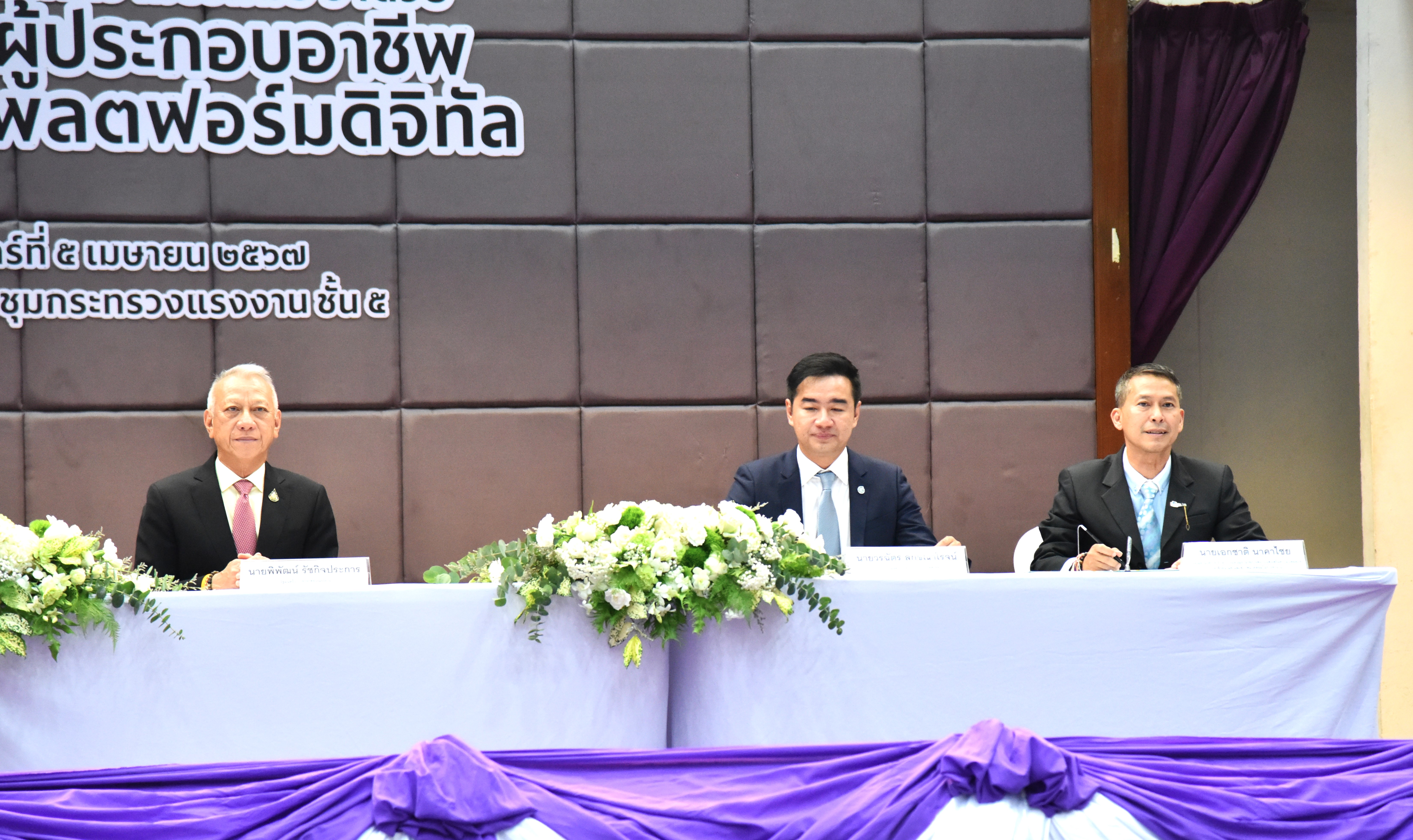 On April 5, 2024, at 14.00 hours, the Labour Minister, Mr. Phiphat Ratchakitprakarn, presided over the signing ceremony of the Memorandum of Understanding on the care of professionals in the platform system. The Labour Minister’s Advisor, Mr. Thanat Thaweekueakulkit, the Secretariat to the Labour Minister, Mr. Aree Krainara, from the Prime Minister’s Secretariat’s Office, performing duties for the Ministry of Labour, Mr. Phuchong Worasri, the Permanent Secretary of Labour, Mr. Pairoj Chotikasathien, and the Ministry of Labour’s executives joined the occasion. The Department of Labour Protection and Welare’s Director-General, Mrs. Sopa Kiatniracha, and the Department of Employment’s Director-General, Mr. Somchai Morakotsriwan, joined in signing at the Ministry of Labour’s meeting room, 5th floor, Ministry of Labour.