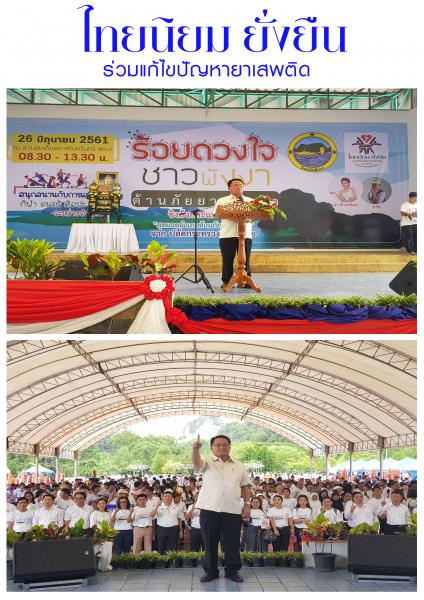 เมื่อวันที่ 26 มิถุนายน 2561 จังหวัดพังงาโดยผู้ว่าราชการจังหวัดพังงา (นายสิทธิชัย ศักดา) ได้จัดกิจกรรมวันต่อต้านยาเสพติดโลก ขึ้น ณ สวนสมเด็จพระศรีนครินทร์จังหวัดพังงา ภายในงานมีกิจกรรมเดินรณรงค์ป้องกันและแก้ไขปัญหายาเสพติดจาก 8 อำเภอภายใต้คำขวัญ "ร้อยดวงใจชาวพังงาต้านภัยยาเสพติด"