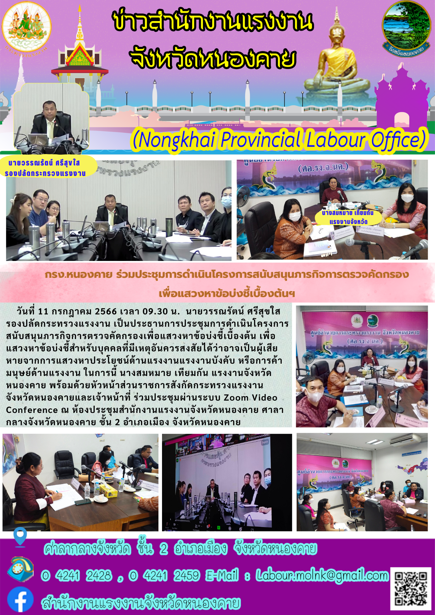 วันที่ 11 กรกฎาคม 2566 เวลา 09.30 น. นายวรรณรัตน์ ศรีสุขใส รองปลัดกระทรวงแรงงาน เป็นประธานการประชุมการดำเนินโครงการสนับสนุนภารกิจการตรวจคัดกรองเพื่อแสวงหาข้อบ่งชี้เบื้องต้น เพื่อแสวงหาข้อบ่งชี้สำหรับบุคคลที่มีเหตุอันควรสงสัยได้ว่าอาจเป็นผู้เสียหายจากการแสวงหาประโยชน์ด้านแรงงานแรงงานบังคับ หรือการค้ามนุษย์ด้านแรงงาน ในการนี้ นางสมหมาย เทียมกัน แรงงานจังหวัดหนองคาย พร้อมด้วยหัวหน้าส่วนราชการสังกัดกระทรวงแรงงานจังหวัดหนองคายและเจ้าหน้าที่ ร่วมประชุมผ่านระบบ Zoom Video Conference ณ ห้องประชุมสำนักงานแรงงานจังหวัดหนองคาย ศาลากลางจังหวัดหนองคาย ชั้น 2 อำเภอเมือง จังหวัดหนองคาย