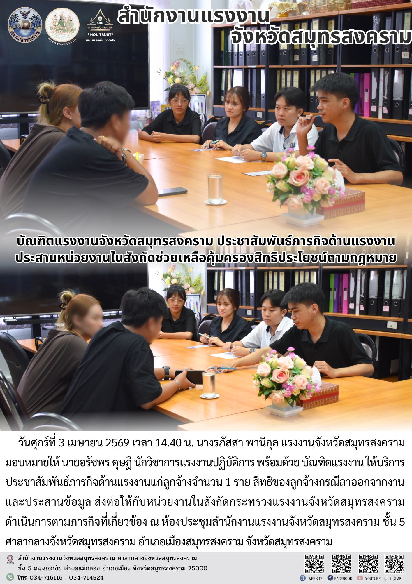 บัณฑิตแรงงานจังหวัดสมุทรสงคราม ประชาสัมพันธ์ภารกิจด้านแรงงาน ประสานหน่วยงานในสังกัดช่วยเหลือคุ้มครองสิทธิประโยชน์ตามกฎหมาย