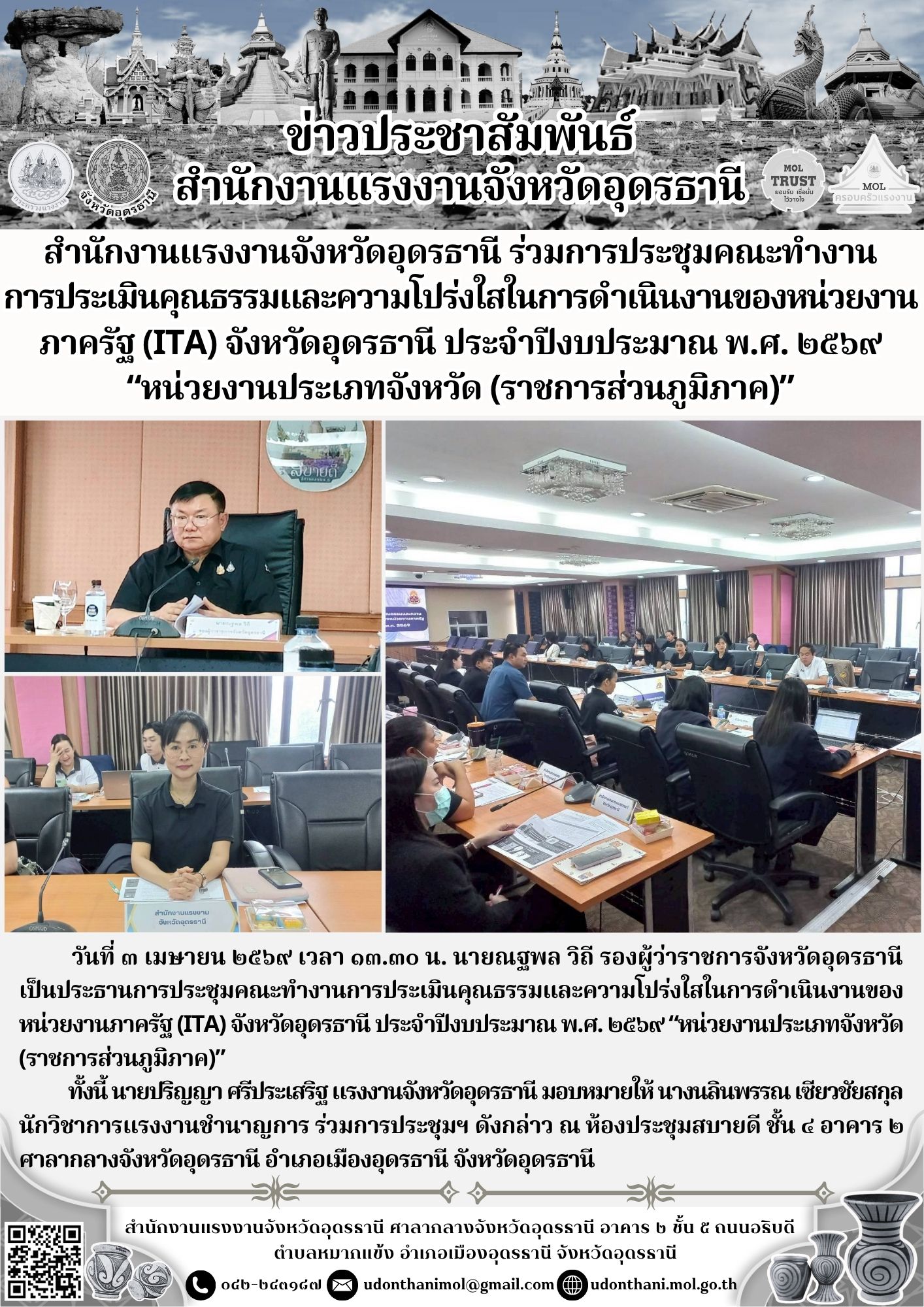สำนักงานแรงงานจังหวัดอุดรธานี ร่วมการประชุมคณะทำงานการประเมินคุณธรรมและความโปร่งใสในการดำเนินงานของหน่วยงานภาครัฐ (ITA) จังหวัดอุดรธานี ประจำปีงบประมาณ พ.ศ. ๒๕๖๙ “หน่วยงานประเภทจังหวัด (ราชการส่วนภูมิภาค)”