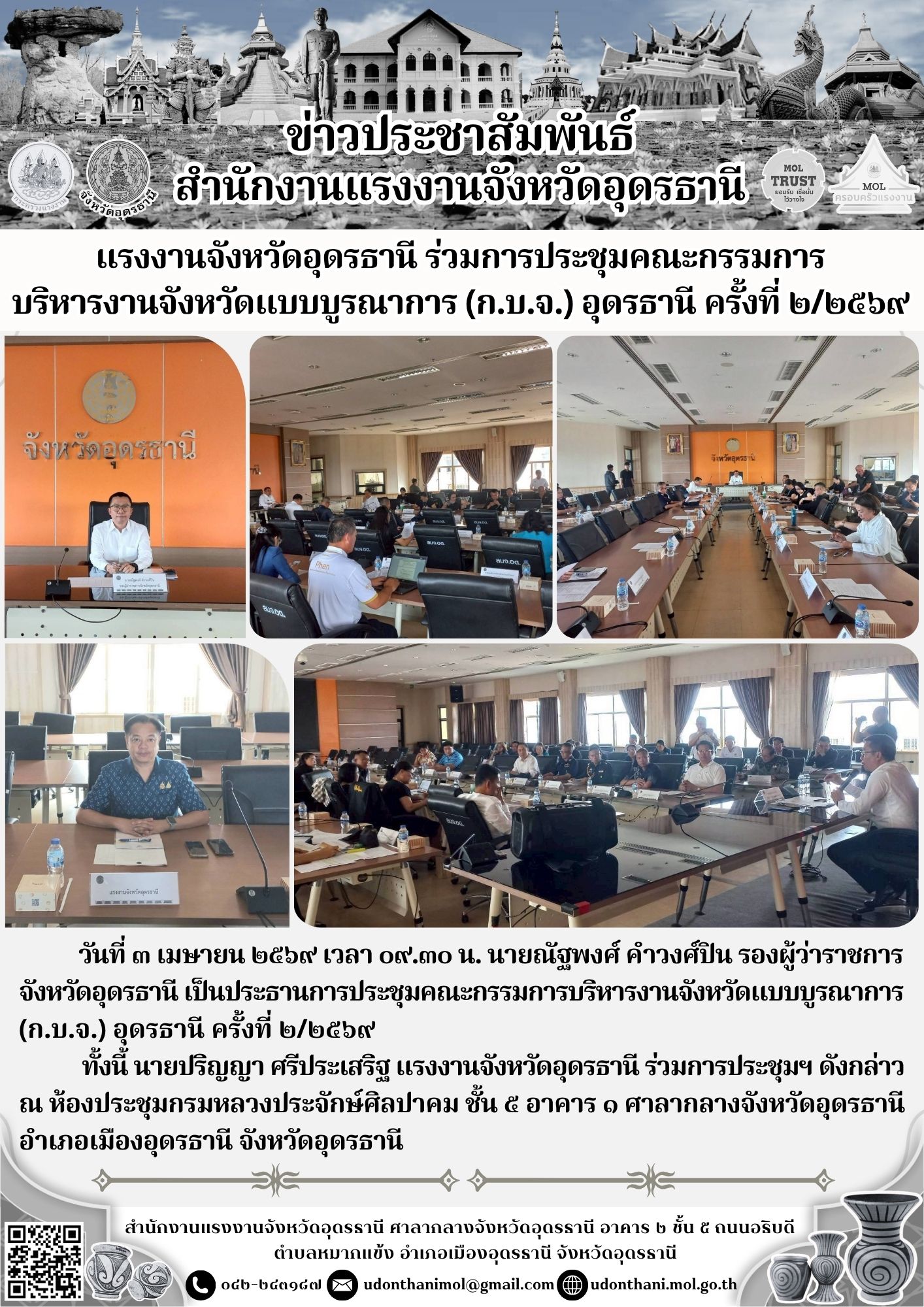 แรงงานจังหวัดอุดรธานี ร่วมการประชุมคณะกรรมการ บริหารงานจังหวัดแบบบูรณาการ (ก.บ.จ.) อุดรธานี ครั้งที่ ๒/๒๕๖๙