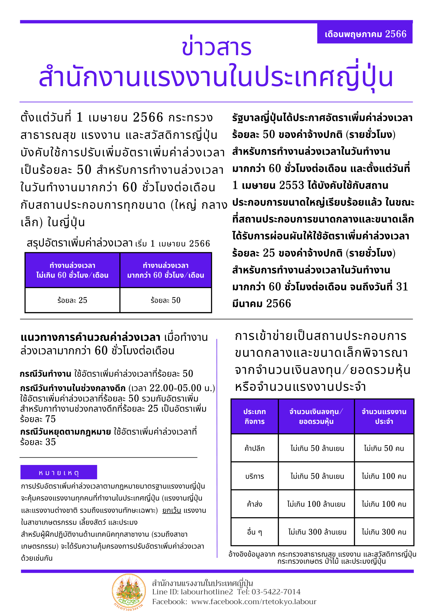ข่าวสารสำนักงานแรงงานในประเทศญี่ปุ่น ประจำเดือนพฤษภาคม 2566 ตั้งแต่วันที่ 1 เมษายน 2566 กระทรวงสาธารณสุข แรงงาน และสวัสดิการญี่ปุ่นบังคับใช้การปรับเพิ่มอัตราเพิ่มค่าล่วงเวลา เป็นร้อยละ 50 สำหรับการทำงานล่วงเวลาในวันทำงานมากกว่า 60 ชั่วโมงต่อเดือน กับสถานประกอบการทุกขนาด (ใหญ่ กลาง เล็ก) ในญี่ปุ่น รายละเอียดตามแนบ