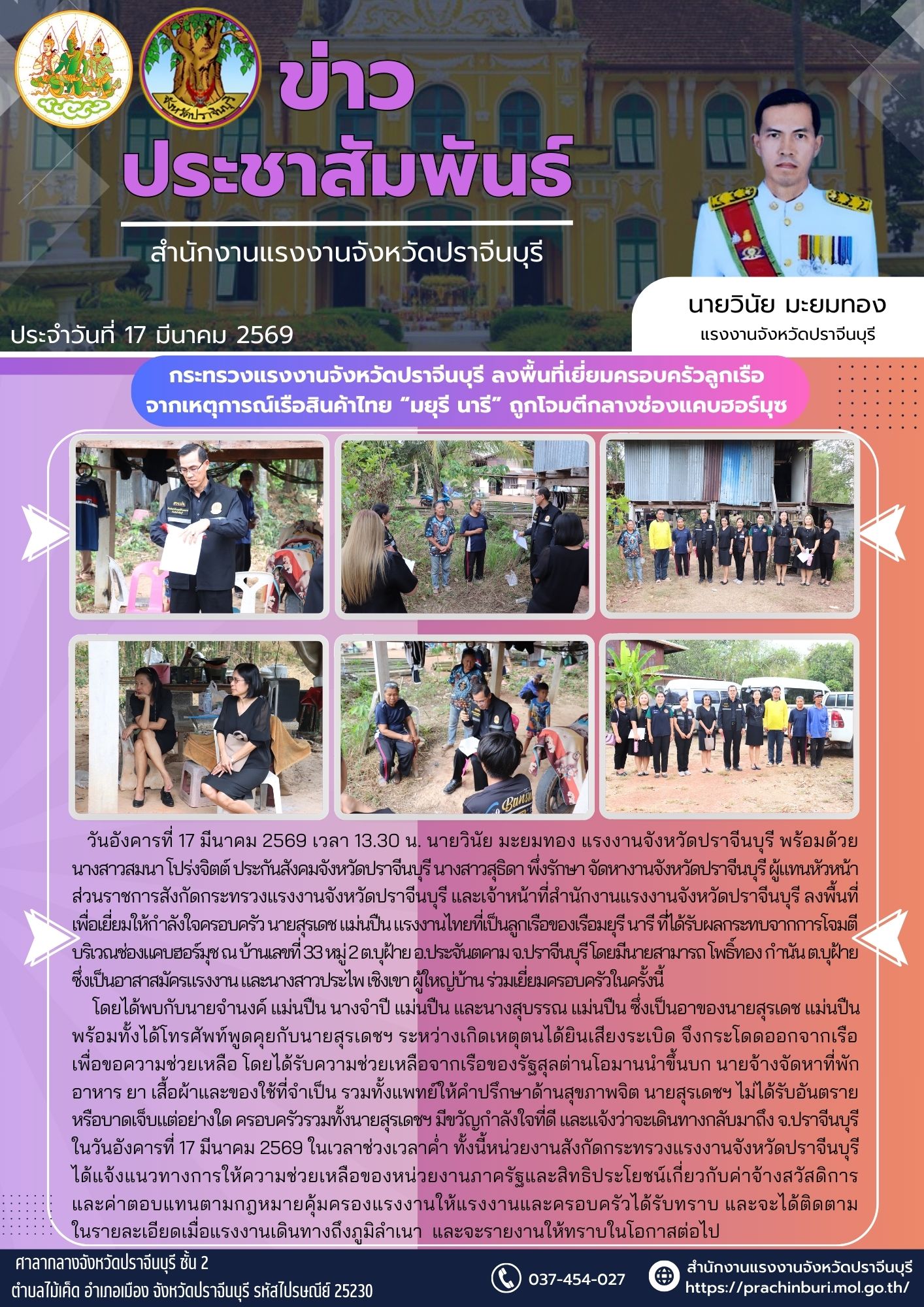 วันอังคารที่ 17 มีนาคม 2569 เวลา 13.30 น. นายวินัย มะยมทอง แรงงานจังหวัดปราจีนบุรี พร้อมด้วย นางสาวสมนา โปร่งจิตต์ ประกันสังคมจังหวัดปราจีนบุรี นางสาวสุธิดา พึ่งรักษา จัดหางานจังหวัดปราจีนบุรี ผู้แทนหัวหน้าส่วนราชการสังกัดกระทรวงแรงงานจังหวัดปราจีนบุรี และเจ้าหน้าที่สำนักงานแรงงานจังหวัดปราจีนบุรี ลงพื้นที่เพื่อเยี่ยมให้กำลังใจครอบครัว นายสุรเดช แม่นปืน แรงงานไทยที่เป็นลูกเรือของเรือมยุรี นารี ที่ได้รับผลกระทบจากการโจมตีบริเวณช่องแคบฮอร์มุช ณ บ้านเลขที่ 33 หมู่ 2 ต.บุฝ้าย อ.ประจันตคาม จ.ปราจีนบุรี โดยมีนายสามารถ โพธิ์ทอง กำนัน ต.บุฝ้าย ซึ่งเป็นอาสาสมัครแรงงาน และนางสาวประไพ เชิงเขา ผู้ใหญ่บ้าน ร่วมเยี่ยมครอบครัวในครั้งนี้ โดยได้พบกับนายจำนงค์ แม่นปืน นางจำปี แม่นปืน และนางสุบรรณ แม่นปืน ซึ่งเป็นอาของนายสุรเดช แม่นปืน พร้อมทั้งได้โทรศัพท์พูดคุยกับนายสุรเดชฯ ระหว่างเกิดเหตุตนได้ยินเสียงระเบิด จึงกระโดดออกจากเรือ เพื่อขอความช่วยเหลือ โดยได้รับความช่วยเหลือจากเรือของรัฐสุลต่านโอมานนำขึ้นบก นายจ้างจัดหาที่พัก อาหาร ยา เสื้อผ้าและของใช้ที่จำเป็น รวมทั้งแพทย์ให้คำปรึกษาด้านสุขภาพจิต นายสุรเดชฯ ไม่ได้รับอันตราย หรือบาดเจ็บแต่อย่างใด ครอบครัวรวมทั้งนายสุรเดชฯ มีขวัญกำลังใจที่ดี และแจ้งว่าจะเดินทางกลับมาถึง จ.ปราจีนบุรี ในวันอังคารที่ 17 มีนาคม 2569 ในเวลาช่วงเวลาค่ำ ทั้งนี้หน่วยงานสังกัดกระทรวงแรงงานจังหวัดปราจีนบุรี ได้แจ้งแนวทางการให้ความช่วยเหลือของหน่วยงานภาครัฐและสิทธิประโยชน์เกี่ยวกับค่าจ้างสวัสดิการ และค่าตอบแทนตามกฎหมายคุ้มครองแรงงานให้แรงงานและครอบครัวได้รับทราบ และจะได้ติดตาม ในรายละเอียดเมื่อแรงงานเดินทางถึงภูมิลำเนา และจะรายงานให้ทราบในโอกาสต่อไป