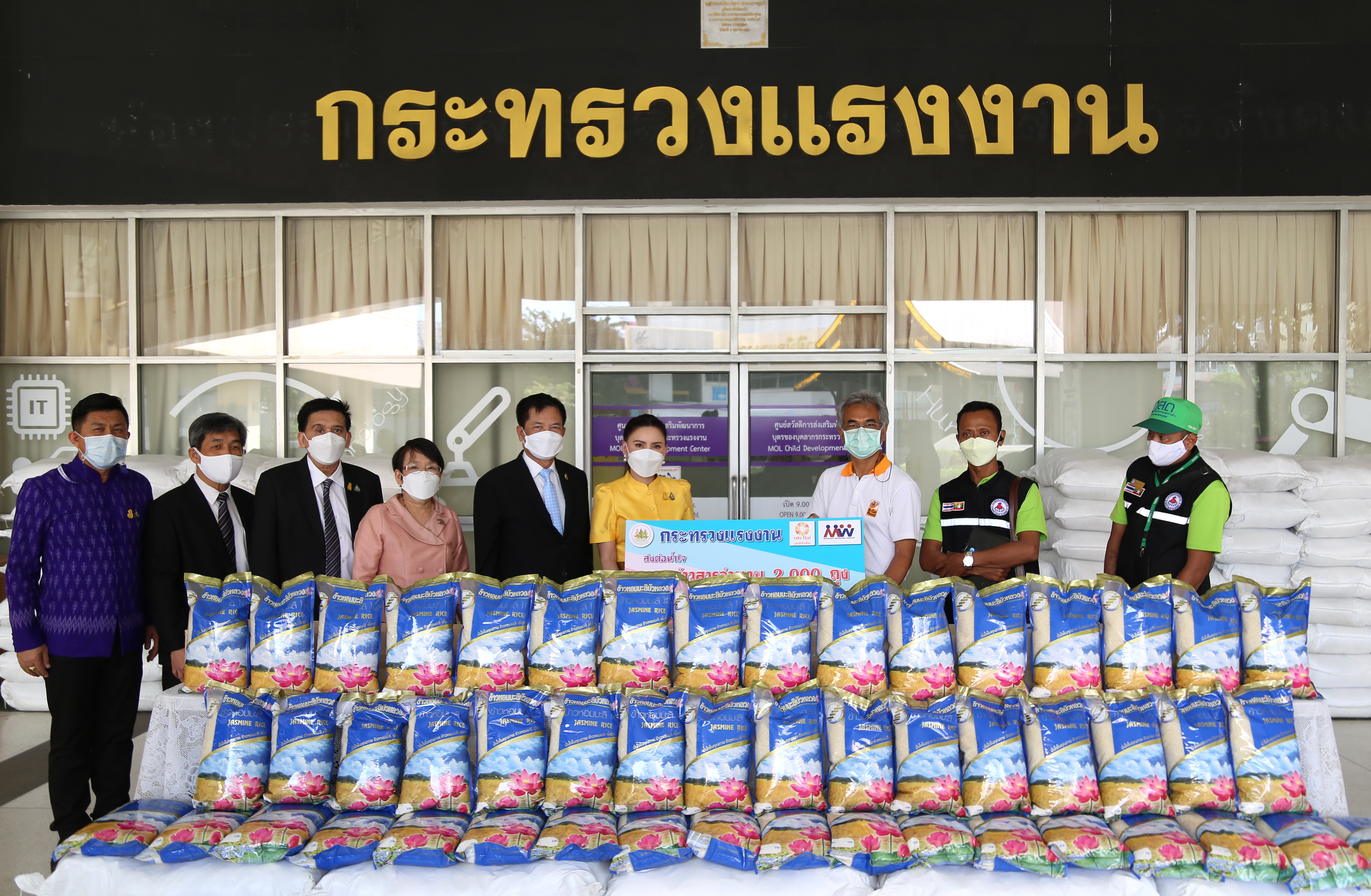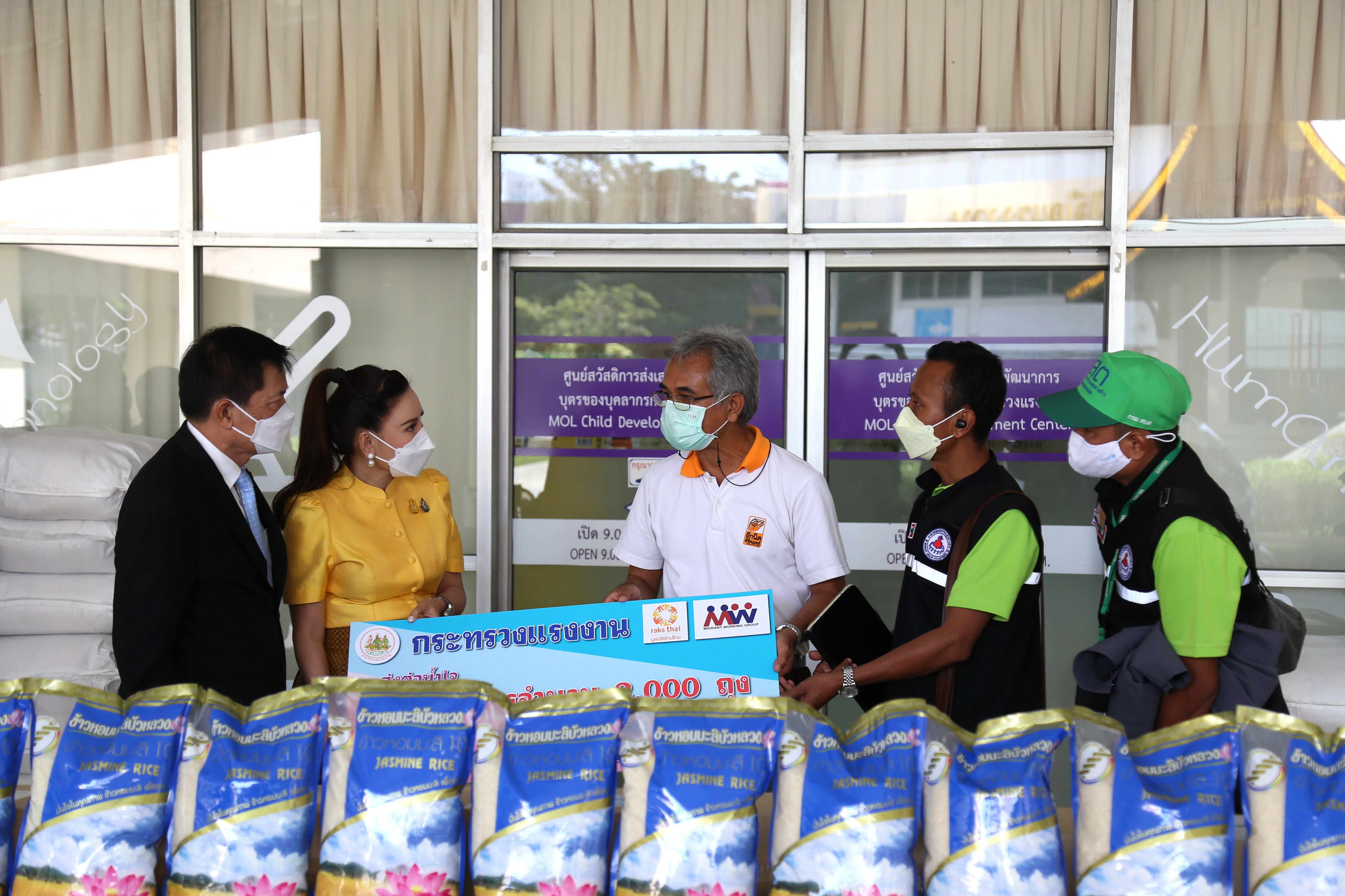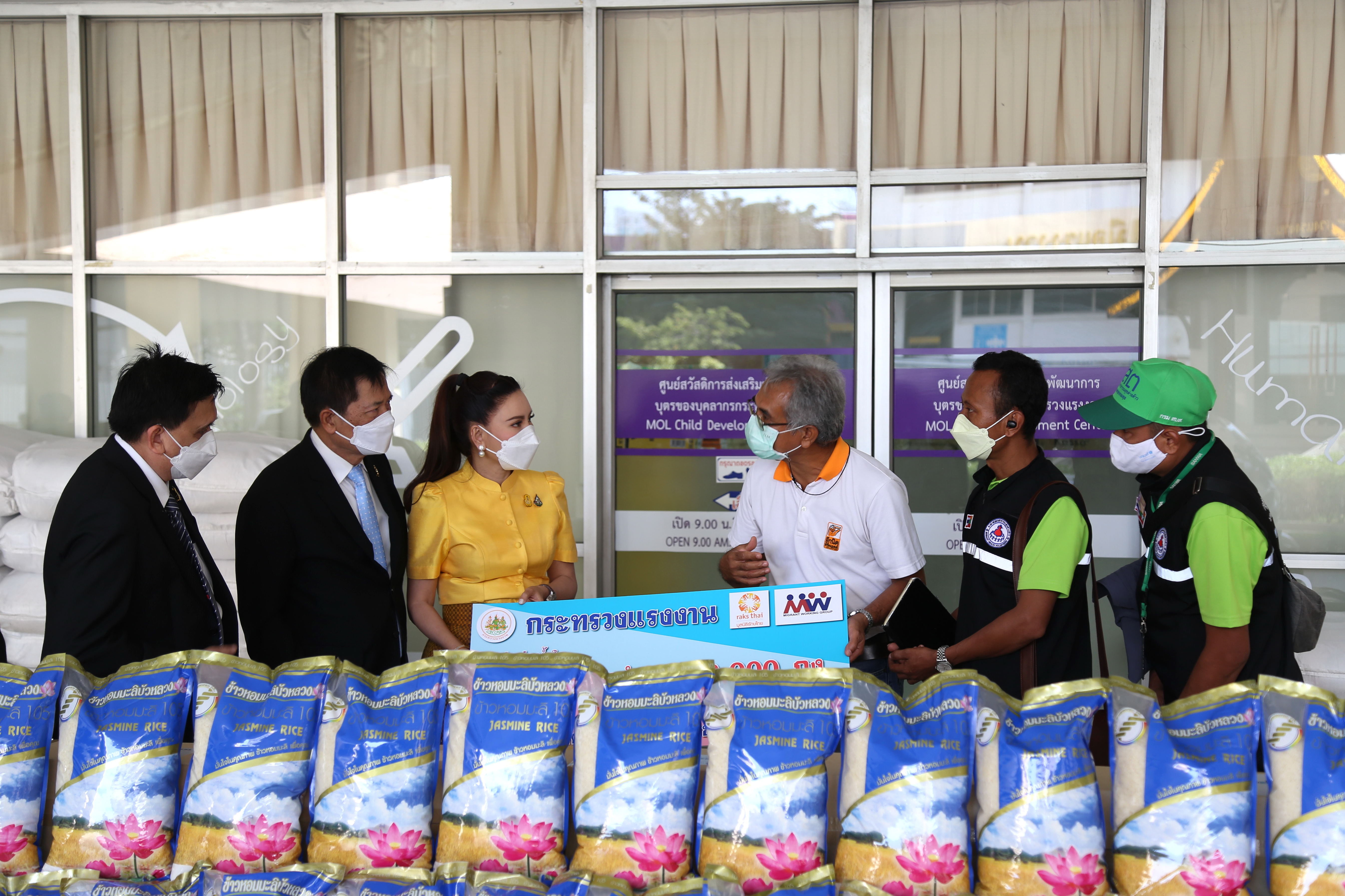 วันที่ 17 ธันวาคม 2564 เวลา 13.00 น. นางธิวัลรัตน์ อังกินันทน์ ที่ปรึกษารัฐมนตรีว่าการกระทรวงแรงงาน นายสุเทพ ชิตยวงษ์ เลขานุการรัฐมนตรีว่าการกระทรวงแรงงาน นางเธียรรัตน์ นะวะมะวัฒน์ โฆษกกระทรวงแรงงาน (ฝ่ายการเมือง) มอบข้าวสาร จำนวน 2,000 ถุง กระทรวงแรงงานส่งต่อน้ำใจ ให้กับมูลนิธิรักษ์ไทย และเครือข่ายองค์กรด้านประชากรข้ามชาติ (MWG) โดยมี นายไพโรจน์ โชติกเสถียร อธิบดีกรมการจัดหางาน นายเฉลิมพงษ์ บุญรอด ผู้ตรวจราชการกรม กรมพัฒนาฝีมือแรงงาน นายสมชาย เอื้อจารุพร ผู้ตรวจราชการกรม กรมสวัสดิการและคุ้มครองแรงงาน ร่วมมอบข้าวสาร ณ บริเวณชั้น 1 อาคารกระทรวงแรงงาน
