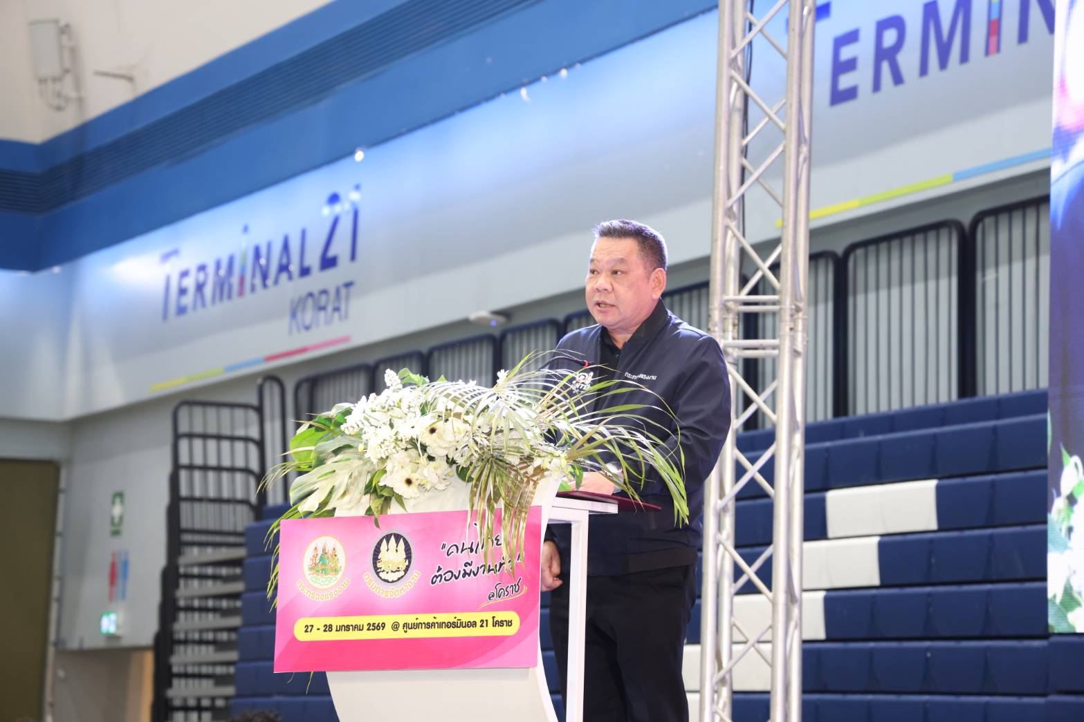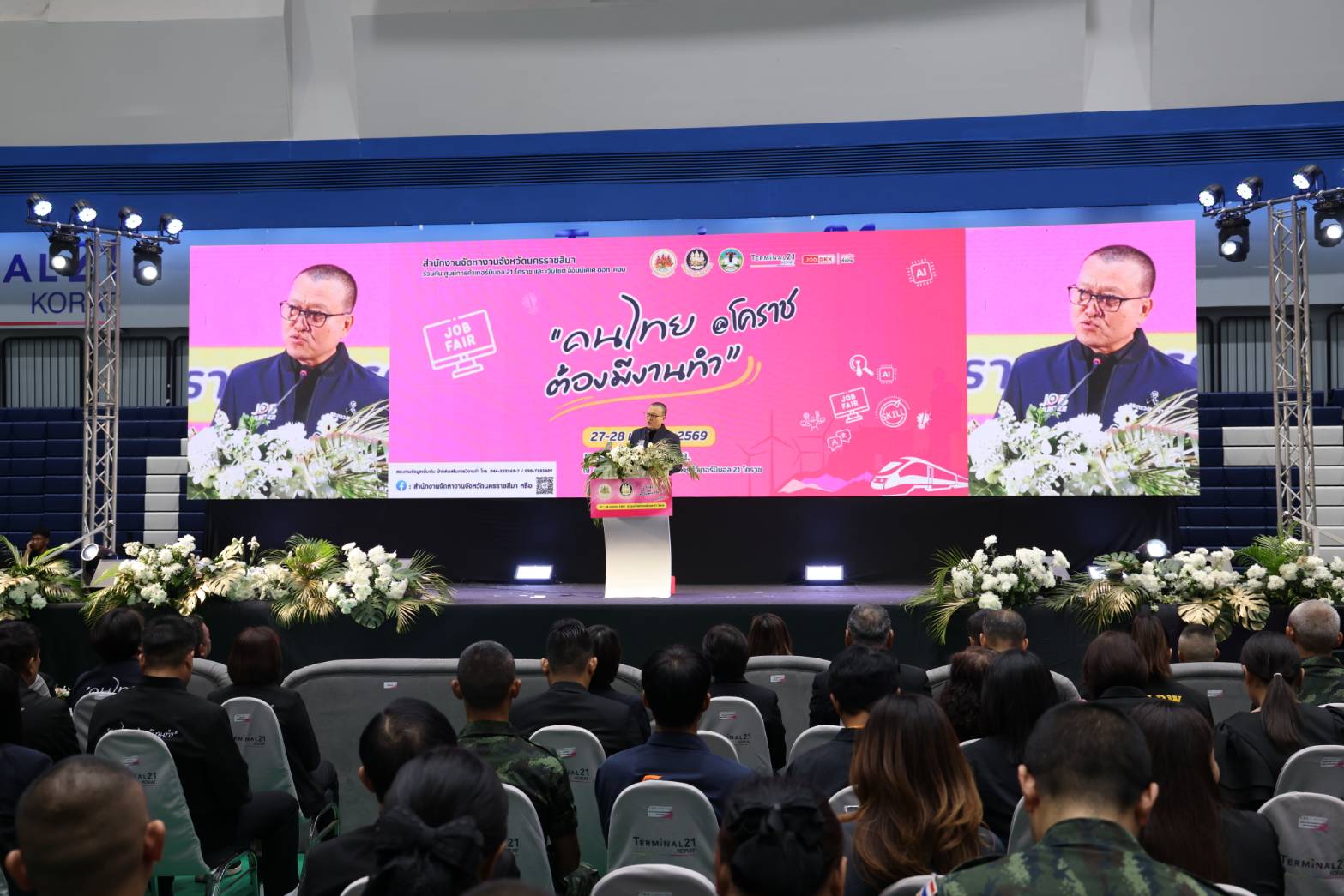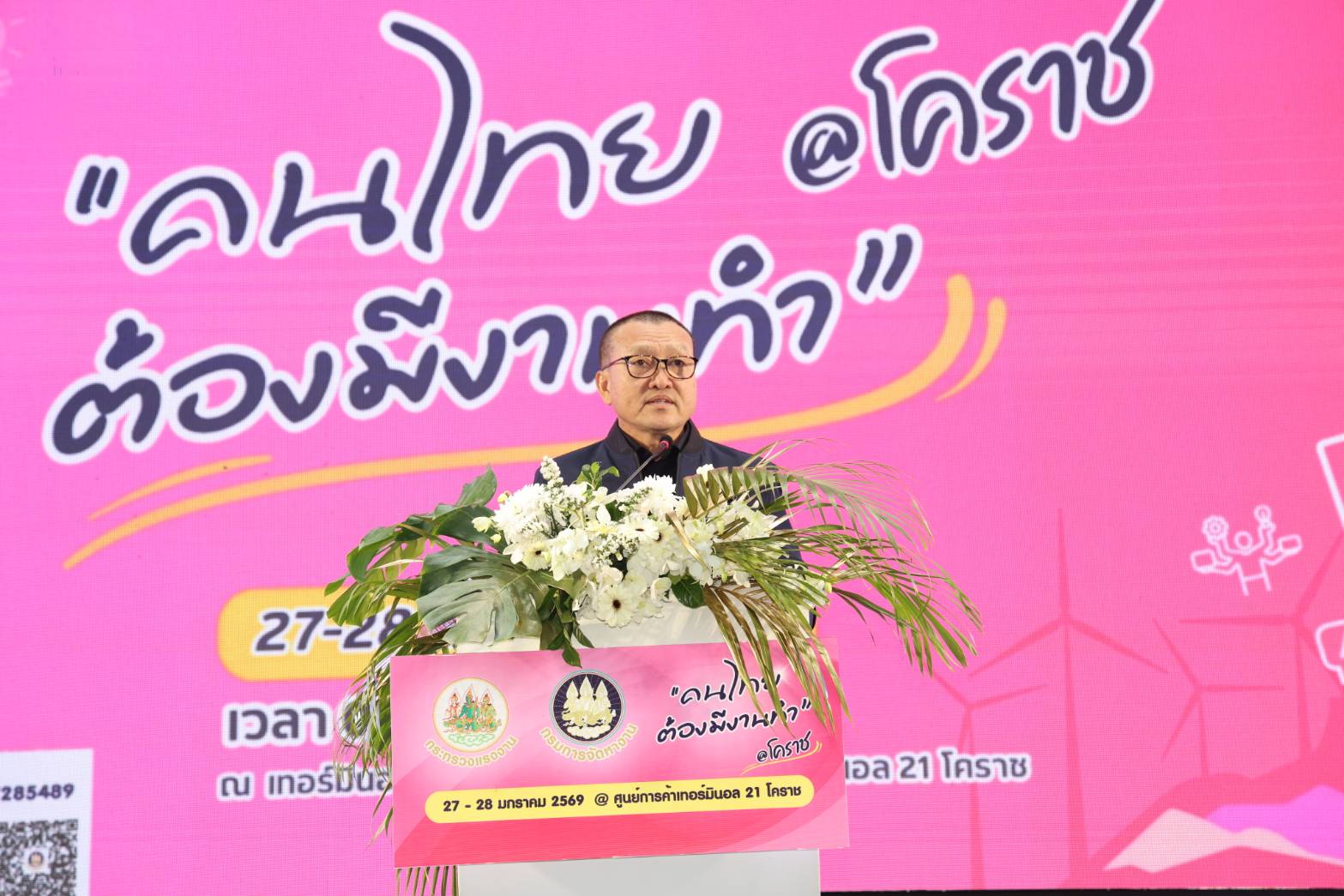 วันที่ 27 มกราคม 2569 พันตำรวจโท วรรณพงษ์ คชรักษ์ ปลัดกระทรวงแรงงาน มอบหมายให้ นายสันติ นันตสุวรรณ รองปลัดกระทรวงแรงงาน เป็นประธานพิธีเปิดงาน “คนไทยต้องมีงานทำ @ โคราช” ประจำปี 2569 โดยนายสมชาย มรกตศรีวรรณ อธิบดีกรมการจัดหางาน ได้มอบหมายให้นายมงคล สงคราม รองอธิบดีกรมการจัดหางาน กล่าวรายงาน นายบัลลังก์ ไวทย์ศิริ รองผู้ว่าราชการจังหวัดนครราชสีมา กล่าวต้อนรับ ผู้บริหารกระทรวงแรงงาน หัวหน้าส่วนราชการสังกัดกระทรวงแรงงานจังหวัดนครราชสีมา ร่วมเป็นเกียรติ ผู้อำนวยการศูนย์การค้าเทอร์มินอล 21 โคราช ผู้บริหารสถานศึกษา คณะครูอาจารย์ ผู้ประกอบการ ร่วมให้การต้อนรับ ณ เทอร์มินอลฮอลล์ ชั้น 4 ศูนย์การค้าเทอร์มินอล 21 โคราช จังหวัดนครราชสีมา