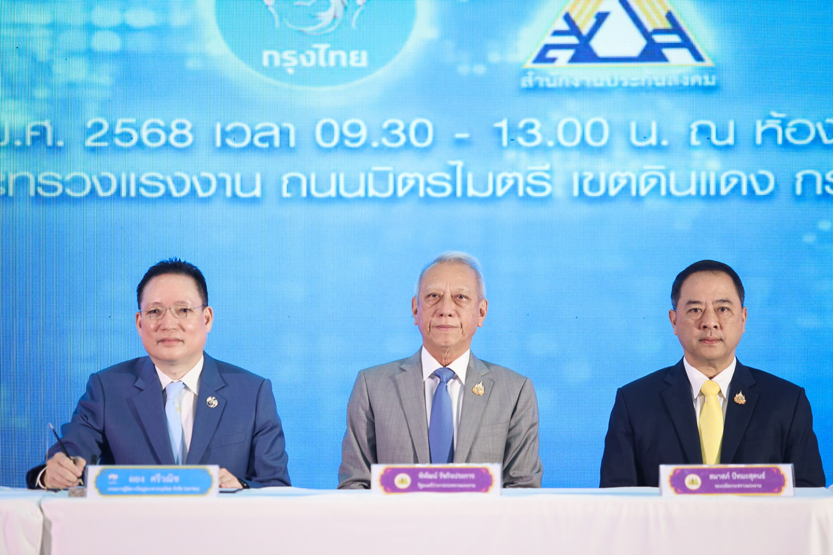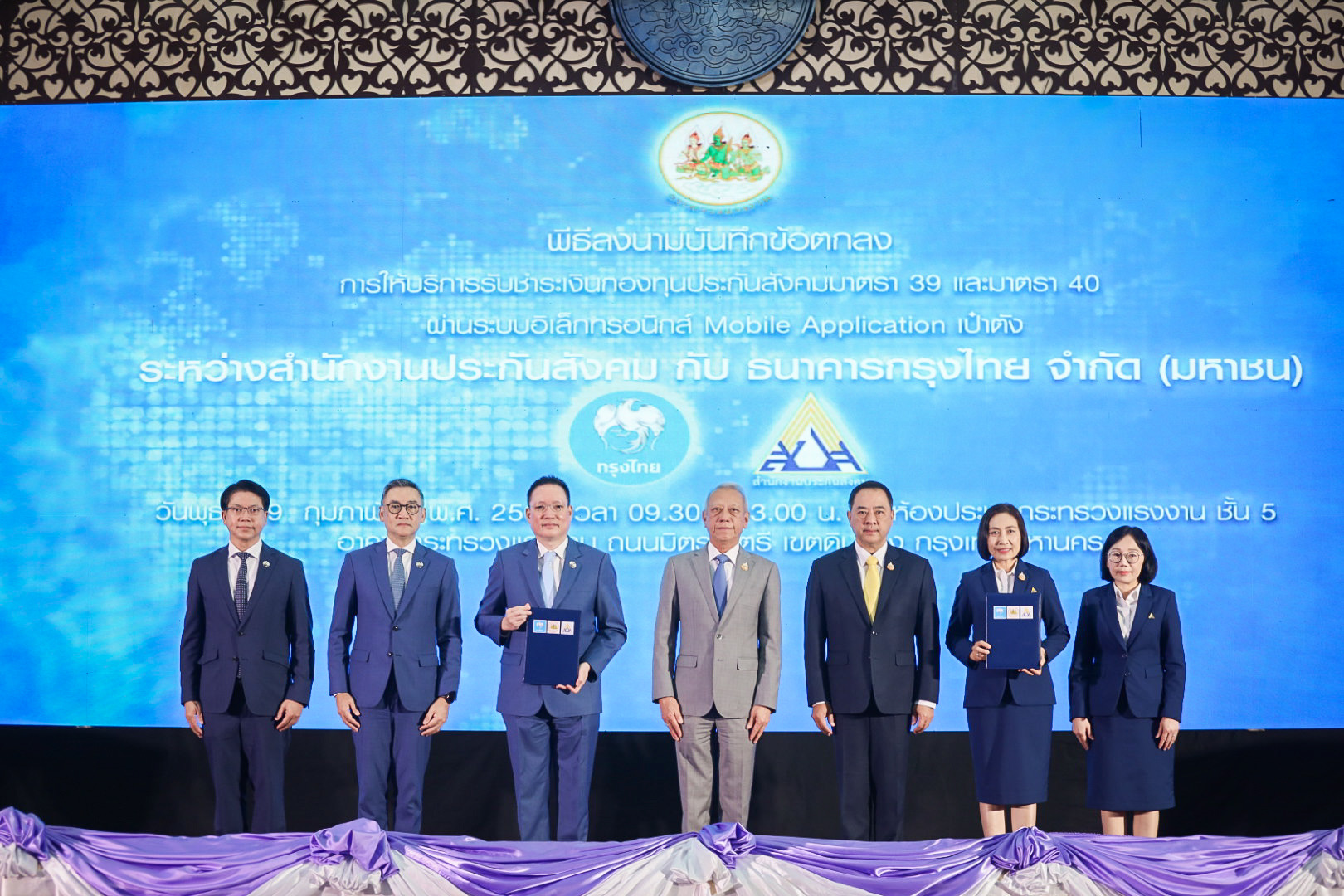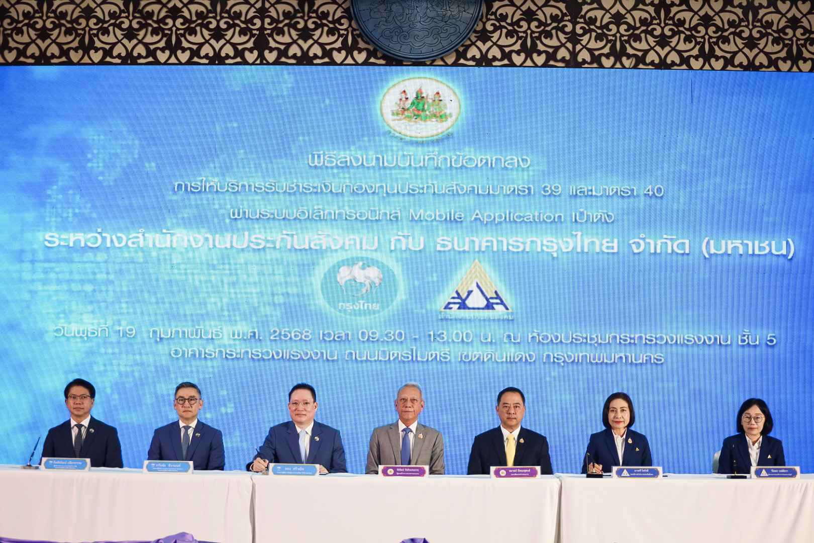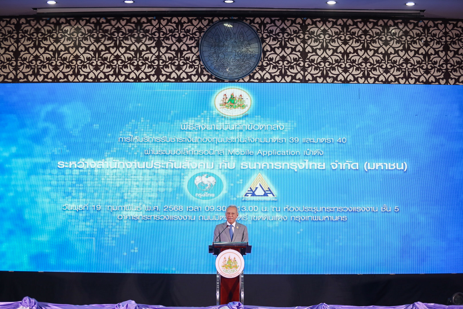 วันที่ 19 กุมภาพันธ์ 2568 นายพิพัฒน์ รัชกิจประการ รัฐมนตรีว่าการกระทรวงแรงงาน เป็นประธานในพิธีลงนามบันทึกข้อตกลงระหว่าง สำนักงานประกันสังคม (สปส.) ลงนามโดย นางมารศรี ใจรังษี เลขาธิการสำนักงานประกันสังคม และ ธนาคารกรุงไทย ลงนามโดย นายผยง ศรีวณิช กรรมการผู้จัดการใหญ่ ธนาคารกรุงไทย จำกัด (มหาชน) โดยมี นายสมาสภ์ ปัทมะสุคนธ์ รองปลัดกระทรวงแรงงาน นายกิตติพัฒน์ เพียรธรรม ผู้บริหารสายงาน สายงานธุรกิจภาครัฐ นายธวัชชัย ชีวานนท์ ประธานผู้บริหาร Product & Business Solutions นางวิไลพร วงษ์อัยรา ผู้อำนวยการกองบริหารการเงินและการบัญชี ร่วมเป็นสักขีพยาน เพื่อเปิดให้บริการ ชำระเงินสมทบกองทุนประกันสังคมมาตรา 39 และมาตรา 40 ผ่านแอปพลิเคชัน “เป๋าตัง” เพิ่มความสะดวกให้แก่ผู้ประกันตน ลดภาระค่าใช้จ่าย และตอบโจทย์ไลฟ์สไตล์ยุคดิจิทัล