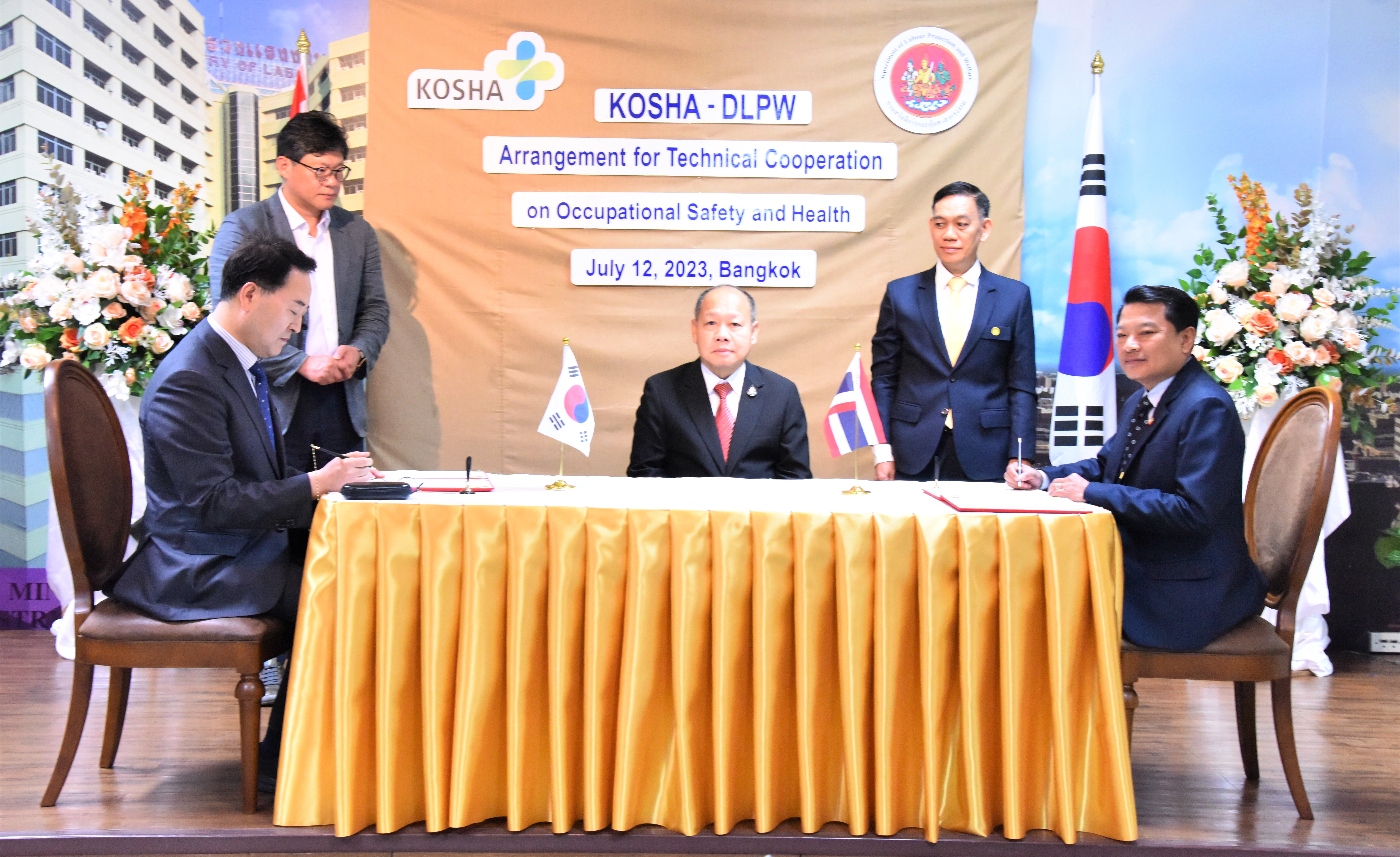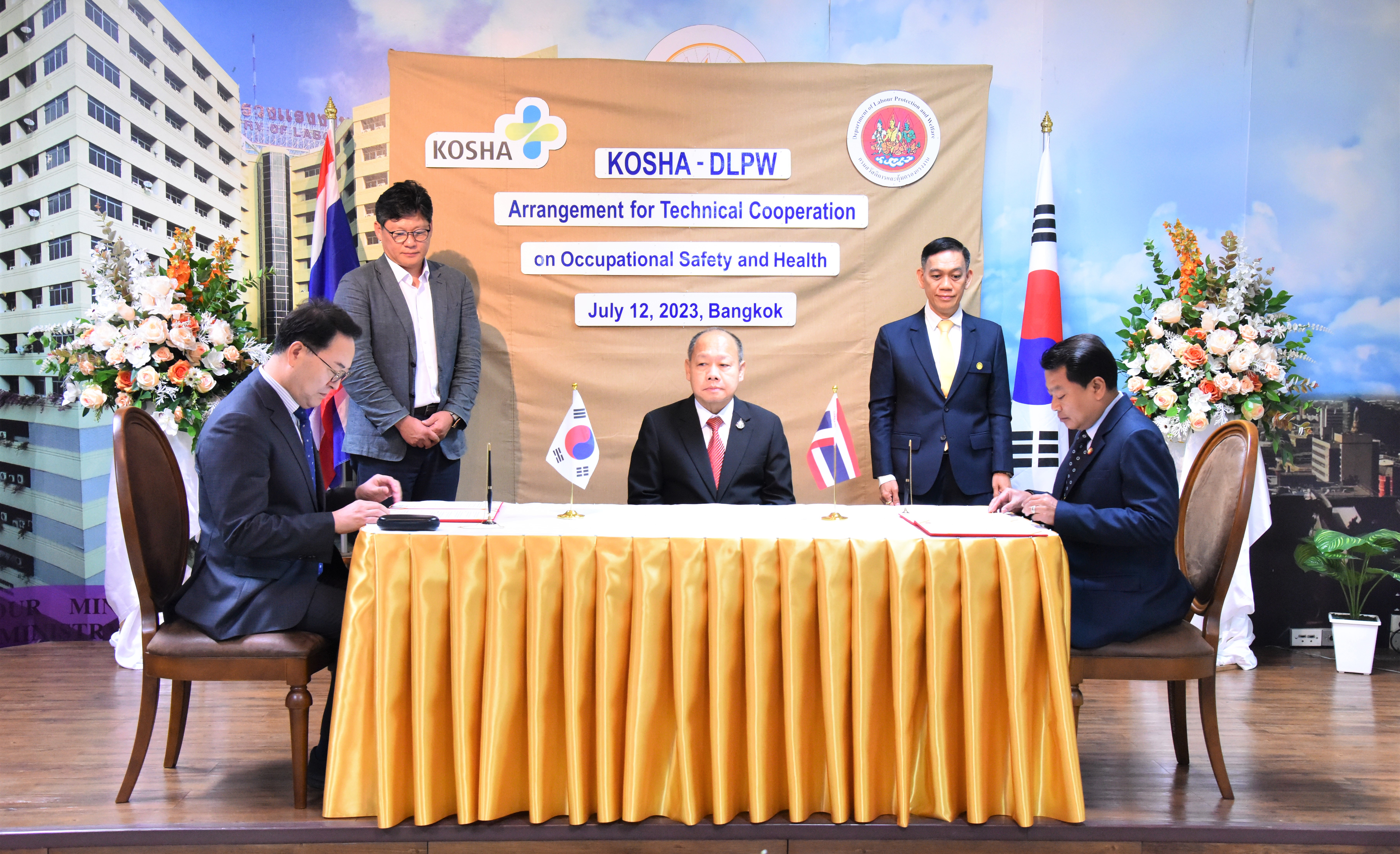 On July 12, 2023, at 13.00 hours, the Permanent Secretary of Labour, Mr. Boonchob Suttamanaswong, assigned the Deputy Permanent Secretary of Labour, Mr. Prateep Songlamyong, to preside over and witness the signing ceremony of the Memorandum of Understanding for Technical Cooperation in Occupational Health and Safety between the Department of Labour Protection and Welfare and the Occupational Health and Safety Organization of South Korea. The initiative aims to facilitate the exchange of information, policies, and practices that can be applied, including expert support for various academic and technical training, consulting, advice, seminars, workshops, or research projects on a topic of common interest. It also allows for the exchange of academic information and tools for workplace health and safety, which helps develop competence in academic security and occupational health in Thailand, supporting to promote safety and better health for workers of both countries. The occasion took place in the reception hall on the 5th floor of the Ministry of Labour’s building. The ceremony was attended by the Department of Labour Protection and Welfare’s Inspector-General, Mr. Somphot Kwangkaew, and the Vice President of Occupational Health and Safety Organization of South Korea, Mr. Ryoo Jang Jin, as the signatory among the witnesses from both parties.