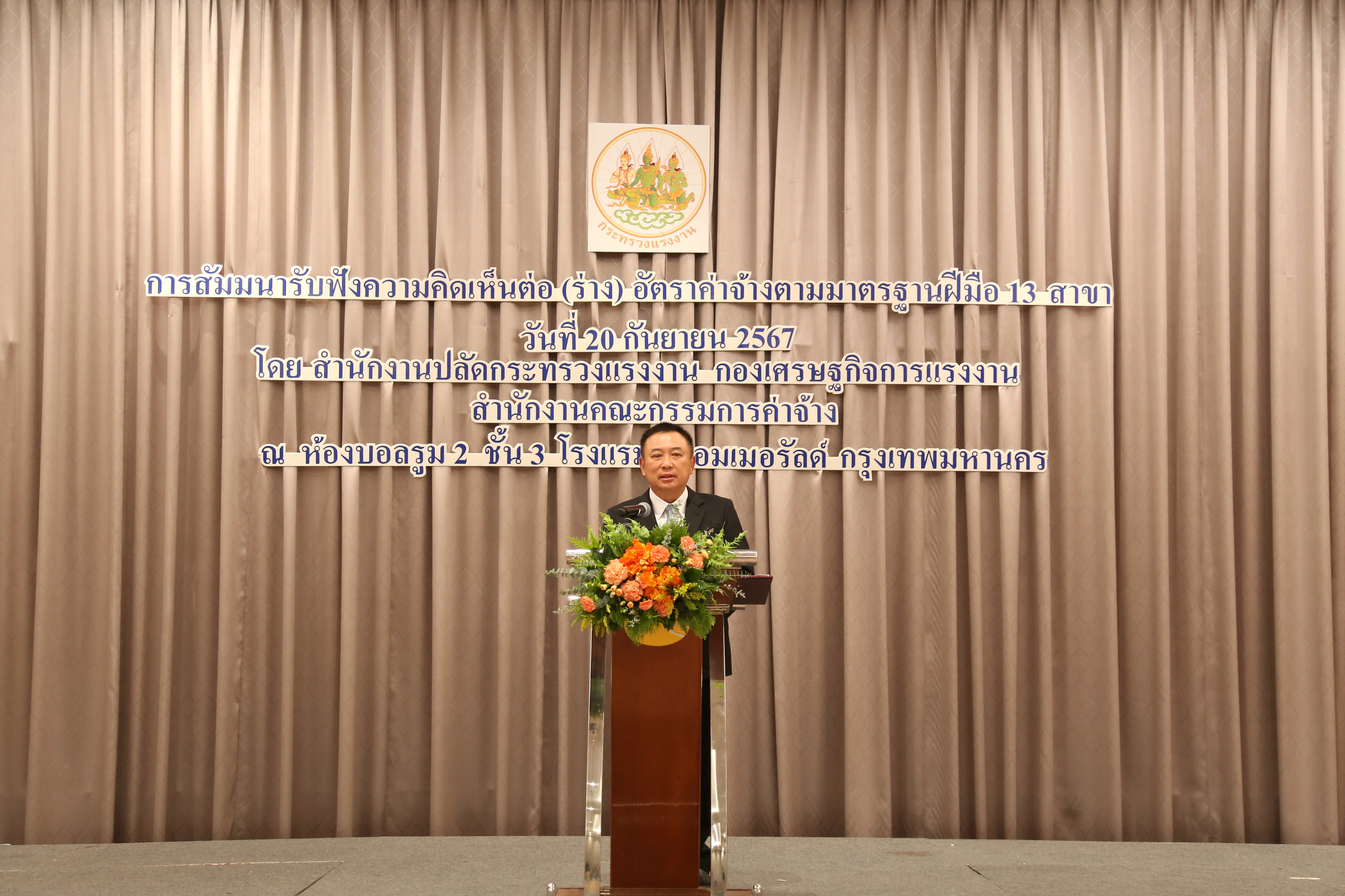 “การรับฟังความคิดเห็นต่อ (ร่าง) อัตราค่าจ้างตามมาตรฐานฝีมือใน 3 กลุ่มสาขาอาชีพ ประกอบด้วย กลุ่มสาขาอาชีพช่างเครื่องกล กลุ่มสาชาอาชีพช่างไฟฟ้า อิเล็กทรอนิกส์และคอมพิวเตอร์ และกลุ่มสาขาอาชีพภาคบริการ จำนวน 13 สาขา ในวันนี้ ขอเชิญชวนทุกท่านได้ร่วมแสดงความคิดเห็นและให้ข้อเสนอแนะอย่างเต็มที่ เพื่อให้การกำหนดอัตราค่าจ้างตามมาตรฐานฝีมือทั้ง 13 สาขา สอดคล้องกับสภาพความเป็นจริงในตลาดแรงงานไทยมากที่สุด และกระทรวงแรงงานจะได้นำข้อเสนอแนะต่างๆ ที่ได้รับจากทุกท่านนำเสนอคณะกรรมการค่าจ้างเพื่อพิจารณาต่อไป” รองปลัดกระทรวงแรงงาน กล่าว