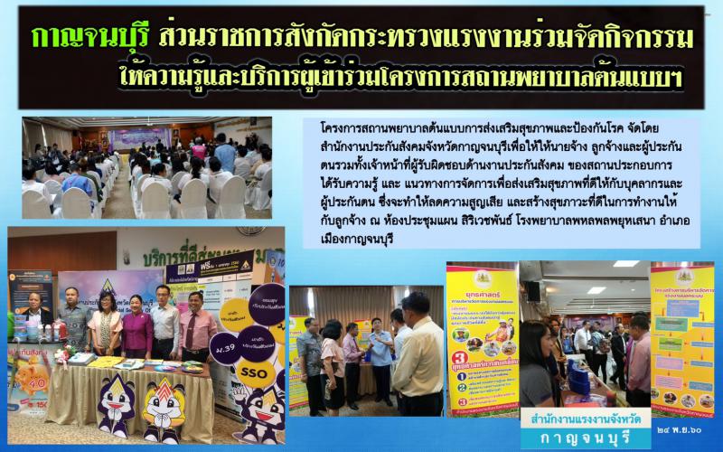 ‘กาญจนบุรี’ ส่วนราชการสังกัดกระทรวงแรงงานร่วมจัดกิจกรรมให้ความรู้และบริการผู้เข้าร่วมโครงการสถานพยาบาลต้นแบบฯ โครงการสถานพยาบาลต้นแบบการส่งเสริมสุขภาพและป้องกันโรค จัดโดยสำนักงานประกันสังคมจังหวัดกาญจนบุรีเพื่อให้นายจ้าง ลูกจ้างและผู้ประกันตนรวมทั้งเจ้าหน้าที่ผู้รับผิดชอบด้านงานประกันสังคม ของสถานประกอบการได้รับรู้ และแนวทางการจัดการเพื่อส่งเสริมสุขภาพที่ดีให้บุคลากรและผู้ประกันตน ซึ่งจะทำให้ลดความสูญเสีย และสร้างสุขภาวะที่ดีในการทำงานให้กับลูกจ้างณ ห้องประชุมแผน สิริเวชพันธ์ โรงพยาบาลพหลพลพยุหเสนา อำเภอ เมืองกาญจนบุรี