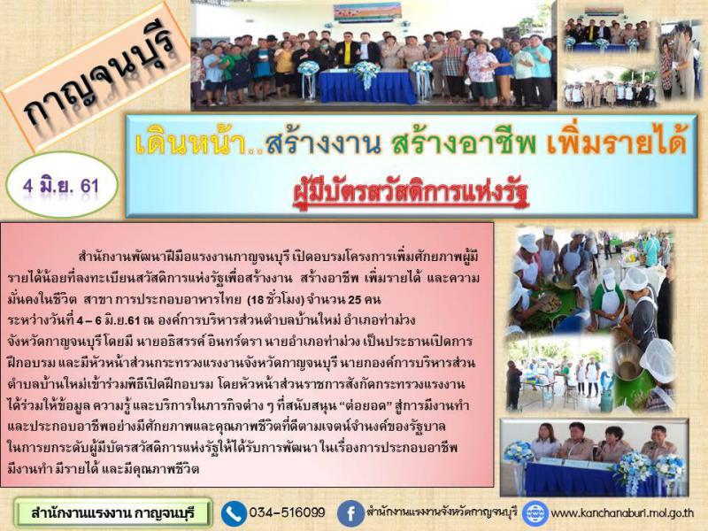 สำนักงานพัฒนาฝีมือแรงงานกาญจนบุรี "สร้างงาน สร้างอาชีพ เพิ่มรายได้ และความมั่นคงในชีวิต" เปิดอบรมโครงการเพิ่มศักยภาพผู้มีรายได้น้อยที่ลงทะเบียนสวัสดิการแห่งรัฐเพื่อสร้างงาน สร้างอาชีพ เพิ่มรายได้ และความมั่นคงในชีวิต สาขา การประกอบอาหารไทย (18 ชั่วโมง) จำนวน 25 คน ระหว่างวันที่ 4– 6 มิ.ย.61 ณ องค์การบริหารส่วนตำบลบ้านใหม่ อำเภอท่าม่วงจังหวัดกาญจนบุรี โดยมี นายอธิสรรค์อินทร์ตรา นายอำเภอท่าม่วง เป็นประธานเปิดการฝึกอบรม และมีหัวหน้าส่วนกระทรวงแรงงานจังหวัดกาญจนบุรี นายกองค์การบริหารส่วนตำบลบ้านใหม่เข้าร่วมพิธีเปิดฝึกอบรม โดยหัวหน้าส่วนราชการสังกัดกระทรวงแรงงานได้ร่วมให้ข้อมูล ความรู้ และบริการในภารกิจต่างๆ ที่สนับสนุน “ต่อยอด” สู่การมีงานทำและประกอบอาชีพอย่างมีศักยภาพและคุณภาพชีวิตที่ดีตามเจตน์จำนงค์ของรัฐบาลในการยกระดับผู้มีบัตรสวัสดิการแห่งรัฐให้ได้รับการพัฒนา ในเรื่องการประกอบอาชีพมีงานทำ มีรายได้ และมีคุณภาพชีวิต